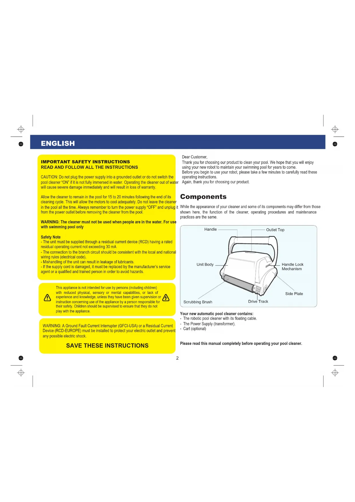 with swimming pool only Safety Note - The unit must be supplied through a residual current device (RCD) having a rated residual operating current not exceeding 30 mA - The connection to the branch circuit should be consistent with the local and national wiring rules (electrical code). - Mishandling of the unit can result in leakage of lubricants. - If the supply cord is damaged, it must be replaced by the manufacturer’s service agent or a qualified and trained person in order to avoid hazards. Dear Customer, Thank you for choosing our product to clean your pool. We hope that you will enjoy using your new robot to maintain your swimming pool for years to come. Before you begin to use your robot, please take a few minutes to carefully read these operating instructions. Again, thank you for choosing our product. ENGLISH