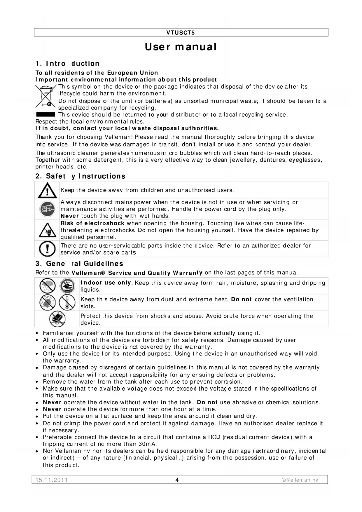Download the instructions for your Ultrasonic cleaner in PDF format for free! Find your manual VTUSCT5 - VELLEMAN and take your electronic device back in hand. On this page are published all the documents necessary for the use of your device. VTUSCT5 by VELLEMAN.