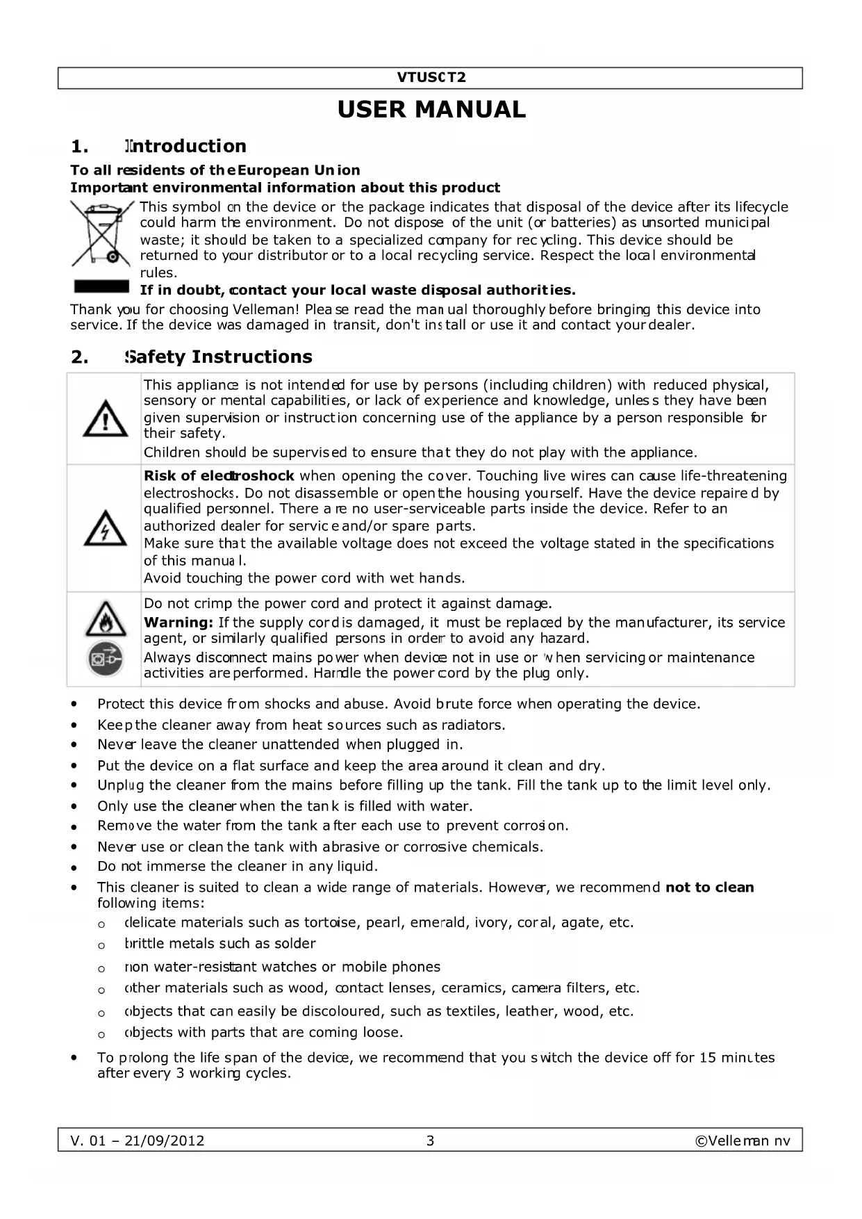 Download the instructions for your Ultrasonic cleaner in PDF format for free! Find your manual VTUSCT2 - VELLEMAN and take your electronic device back in hand. On this page are published all the documents necessary for the use of your device. VTUSCT2 by VELLEMAN.