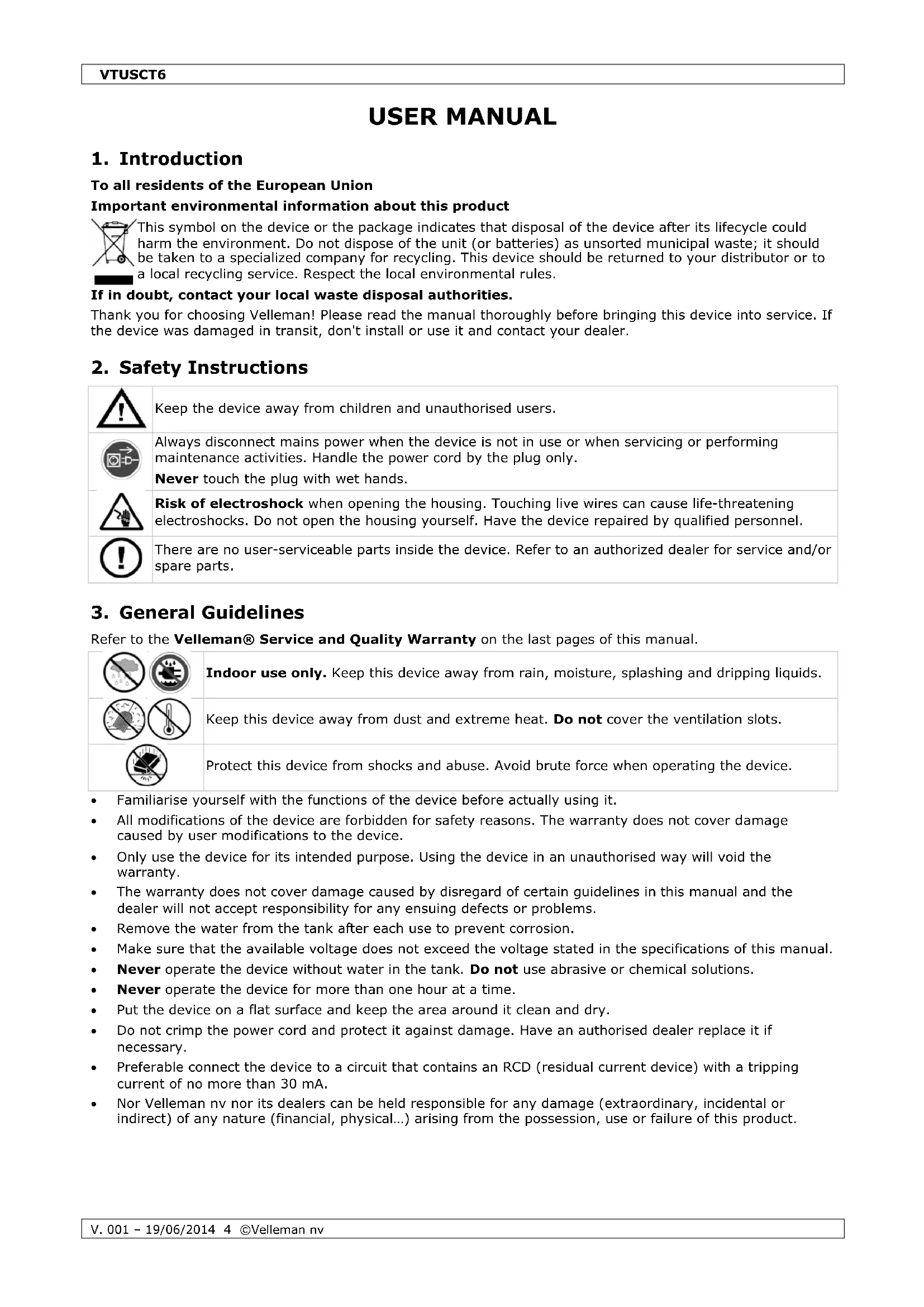 Download the instructions for your Ultrasonic cleaner in PDF format for free! Find your manual VTUSCT6 - VELLEMAN and take your electronic device back in hand. On this page are published all the documents necessary for the use of your device. VTUSCT6 by VELLEMAN.