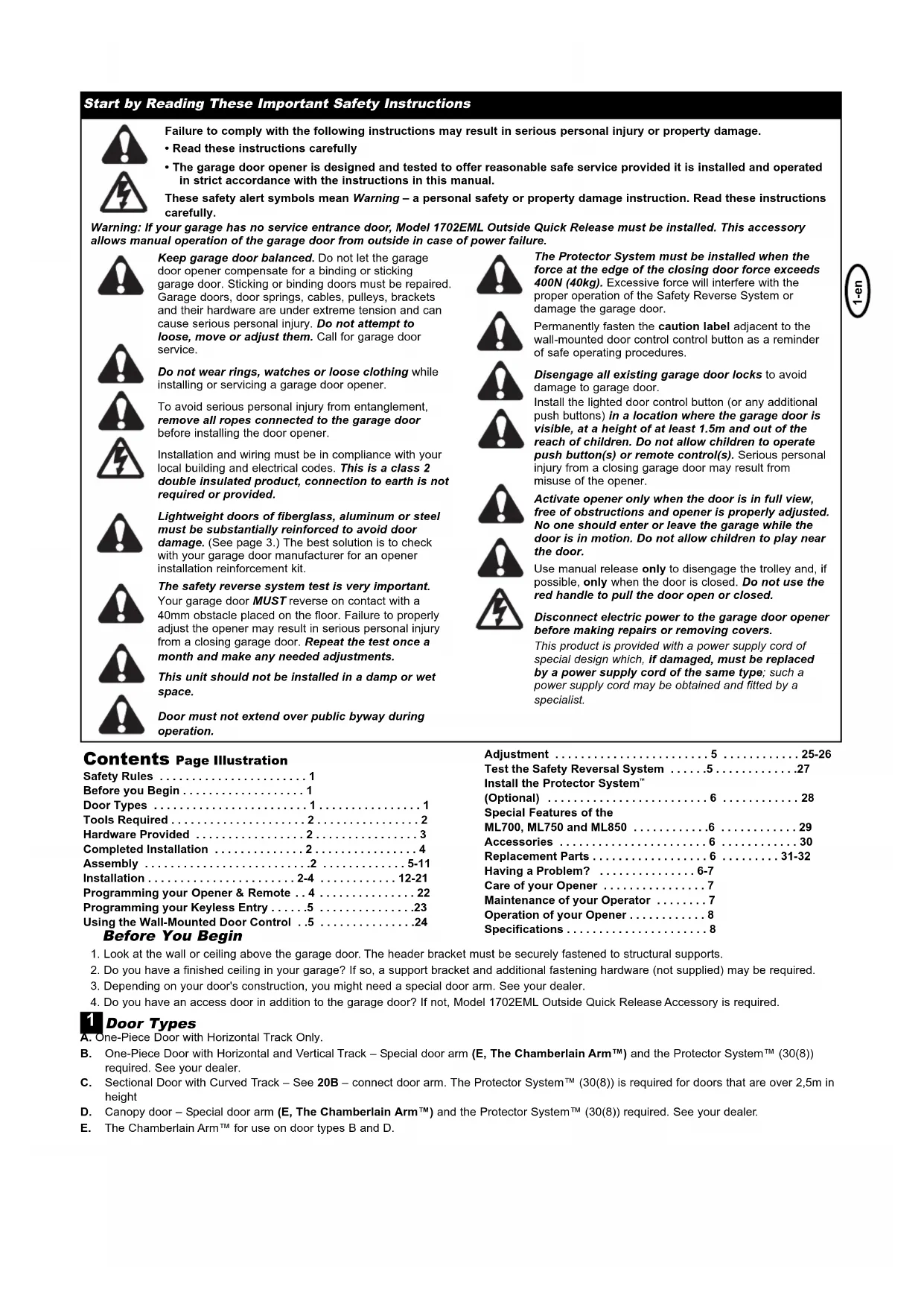 - The garage door opener is designed and tested to offer reasonable safe service provided it is installed and operated in strict accordance with the instructions in this manual. These safety alert symbols mean Warning – a personal safety or property damage instruction. Read these instructions carefully. Warning: If your garage has no service entrance door, Model 1702EML Outside Quick Release must be installed. This accessory allows manual operation of the garage door from outside in case of power failure. Keep garage door balanced. Do not let the garage door opener compensate for a binding or sticking garage door. Sticking or binding doors must be repaired. Garage doors, door springs, cables, pulleys, brackets and their hardware are under extreme tension and can cause serious personal injury. Do not attempt to loose, move or adjust them. Call for garage door service. Do not wear rings, watches or loose clothing while installing or servicing a garage door opener. To avoid serious personal injury from entanglement, remove all ropes connected to the garage door before installing the door opener. Installation and wiring must be in compliance with your local building and electrical codes. This is a class 2 double insulated product, connection to earth is not required or provided. Lightweight doors of fiberglass, aluminum or steel must be substantially reinforced to avoid door damage. (See page 3.) The best solution is to check with your garage door manufacturer for an opener installation reinforcement kit. The safety reverse system test is very important. Your garage door MUST reverse on contact with a 40mm obstacle placed on the floor. Failure to properly adjust the opener may result in serious personal injury from a closing garage door. Repeat the test once a month and make any needed adjustments. This unit should not be installed in a damp or wet space. Door must not extend over public byway during operation. Start by Reading These Important Safety Instructions Before You Begin 1. Look at the wall or ceiling above the garage door. The header bracket must be securely fastened to structural supports. 2. Do you have a finished ceiling in your garage? If so, a support bracket and additional fastening hardware (not supplied) may be required.
