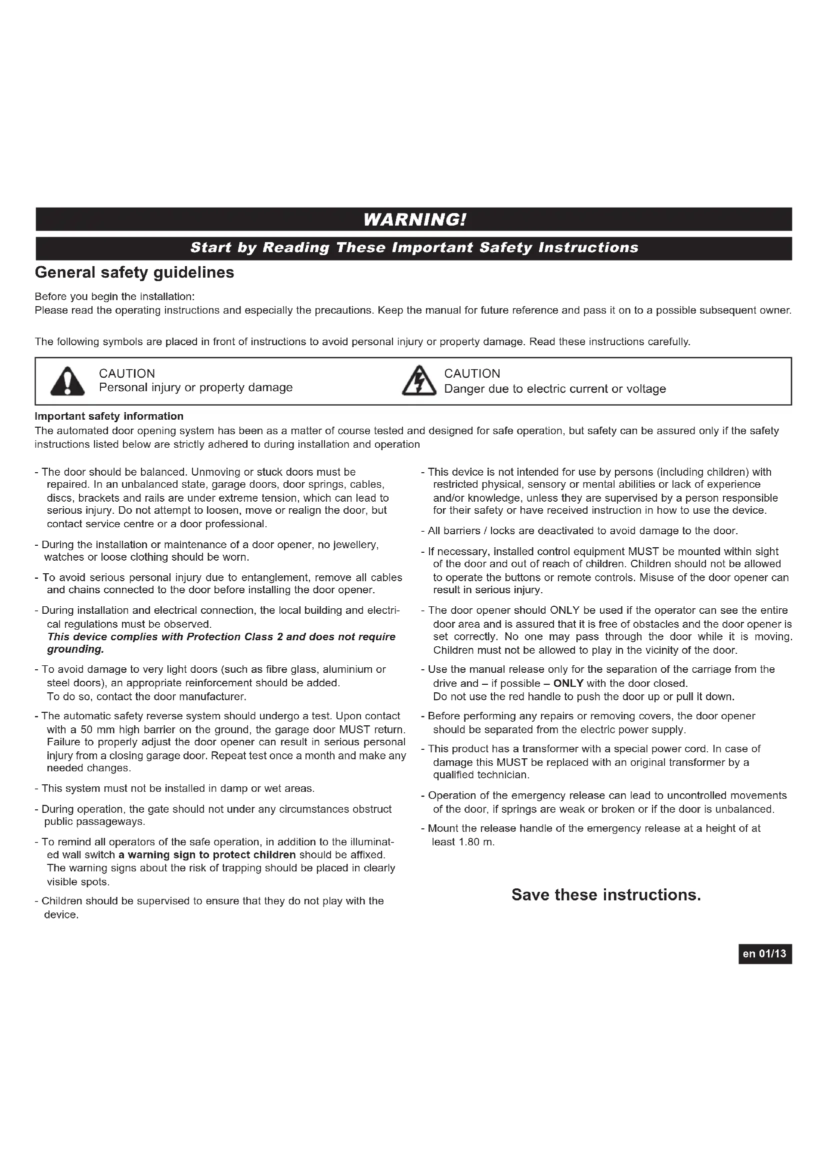 - 37 Declaration of conformity Start by Reading These Important Safety Instructions WARNING! - The door should be balanced. Unmoving or stuck doors must be repaired. In an unbalanced state, garage doors, door springs, cables, discs, brackets and rails are under extreme tension, which can lead to serious injury. Do not attempt to loosen, move or realign the door, but contact service centre or a door professional. - During the installation or maintenance of a door opener, no jewellery, watches or loose clothing should be worn. - To avoid serious personal injury due to entanglement, remove all cables and chains connected to the door before installing the door opener. - During installation and electrical connection, the local building and electri- cal regulations must be observed. This device complies with Protection Class 2 and does not require grounding. - To avoid damage to very light doors (such as fibre glass, aluminium or steel doors), an appropriate reinforcement should be added. To do so, contact the door manufacturer. - The automatic safety reverse system should undergo a test. Upon contact with a 50 mm high barrier on the ground, the garage door MUST return. Failure to properly adjust the door opener can result in serious personal injury from a closing garage door. Repeat test once a month and make any needed changes. - This system must not be installed in damp or wet areas. - During operation, the gate should not under any circumstances obstruct public passageways. - To remind all operators of the safe operation, in addition to the illuminat- ed wall switch a warning sign to protect children should be affixed. The warning signs about the risk of trapping should be placed in clearly visible spots. - Children should be supervised to ensure that they do not play with the device. - This device is not intended for use by persons (including children) with restricted physical, sensory or mental abilities or lack of experience and/or knowledge, unless they are supervised by a person responsible for their safety or have received instruction in how to use the device. - All barriers / locks are deactivated to avoid damage to the door. - If necessary, installed control equipment MUST be mounted within sight of the door and out of reach of children. Children should not be allowed to operate the buttons or remote controls. Misuse of the door opener can result in serious injury. - The door opener should ONLY be used if the operator can see the entire door area and is assured that it is free of obstacles and the door opener is set correctly. No one may pass through the door while it is moving. Children must not be allowed to play in the vicinity of the door. - Use the manual release only for the separation of the carriage from the drive and – if possible – ONLY with the door closed. Do not use the red handle to push the door up or pull it down. - Before performing any repairs or removing covers, the door opener should be separated from the electric power supply. - This product has a transformer with a special power cord. In case of damage this MUST be replaced with an original transformer by a qualified technician. - Operation of the emergency release can lead to uncontrolled movements of the door, if springs are weak or broken or if the door is unbalanced. - Mount the release handle of the emergency release at a height of at least 1.80 m. Save these instructions. CAUTION Personal injury or property damage CAUTION Danger due to electric current or voltage General safety guidelines Before you begin the installation: Please read the operating instructions and especially the precautions. Keep the manual for future reference and pass it on to a possible subsequent owner. The following symbols are placed in front of instructions to avoid personal injury or property damage. Read these instructions carefully. Important safety information The automated door opening system has been as a matter of course tested and designed for safe operation, but safety can be assured only if the safety instructions listed below are strictly adhered to during installation and operation en 01/13Intended use The device is intended for the opening and closing of garage doors (please refer to section 6 “Door Types”). The device is not meant for commercial use but solely for the use in private garage doors that are appropriate for a single household. Any improper use of the drive could increase the risk of accidents. The manufacturer assumes no liability for such usage. Scope of supply Please check the supplied parts for completeness before starting the instal- lation. Note: The numbering only applies to the corresponding section. Product overview This figure always offers you a complete overview of the ready- assembled system during the step by step installation of the system. Parts overview (Drivehead): p. 13