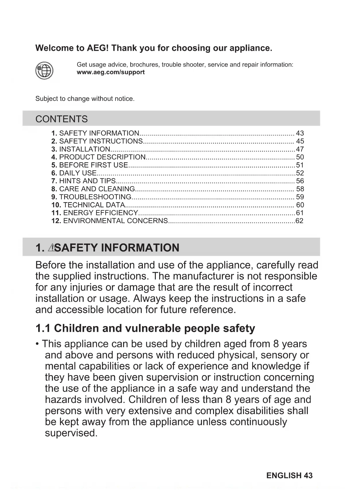 - This appliance can be used by children aged from 8 years and above and persons with reduced physical, sensory or mental capabilities or lack of experience and knowledge if they have been given supervision or instruction concerning the use of the appliance in a safe way and understand the hazards involved. Children of less than 8 years of age and persons with very extensive and complex disabilities shall be kept away from the appliance unless continuously supervised. ENGLISH 43• Children should be supervised to ensure that they do not play with the appliance.