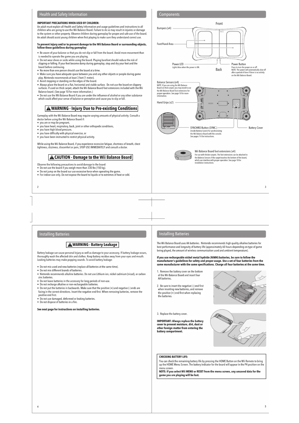 Health and Safety Information 2 Components 3 Installing Batteries 4-5 Placement of the Wii Balance Board 6 Synchronizing the Wii Balance Board with your Wii Console 7-8 Basic Operations 9 Wii Balance Board Foot Extensions 10 Troubleshooting 11 Warranty and Service Information 12 PRINTED IN CHINANINTENDO OF AMERICA INC. P.O. BOX 957, REDMOND, WA 98073-0957 U.S.A.63355A NEED HELP WITH INSTALLATION, MAINTENANCE OR SERVICE? Nintendo Customer Service
