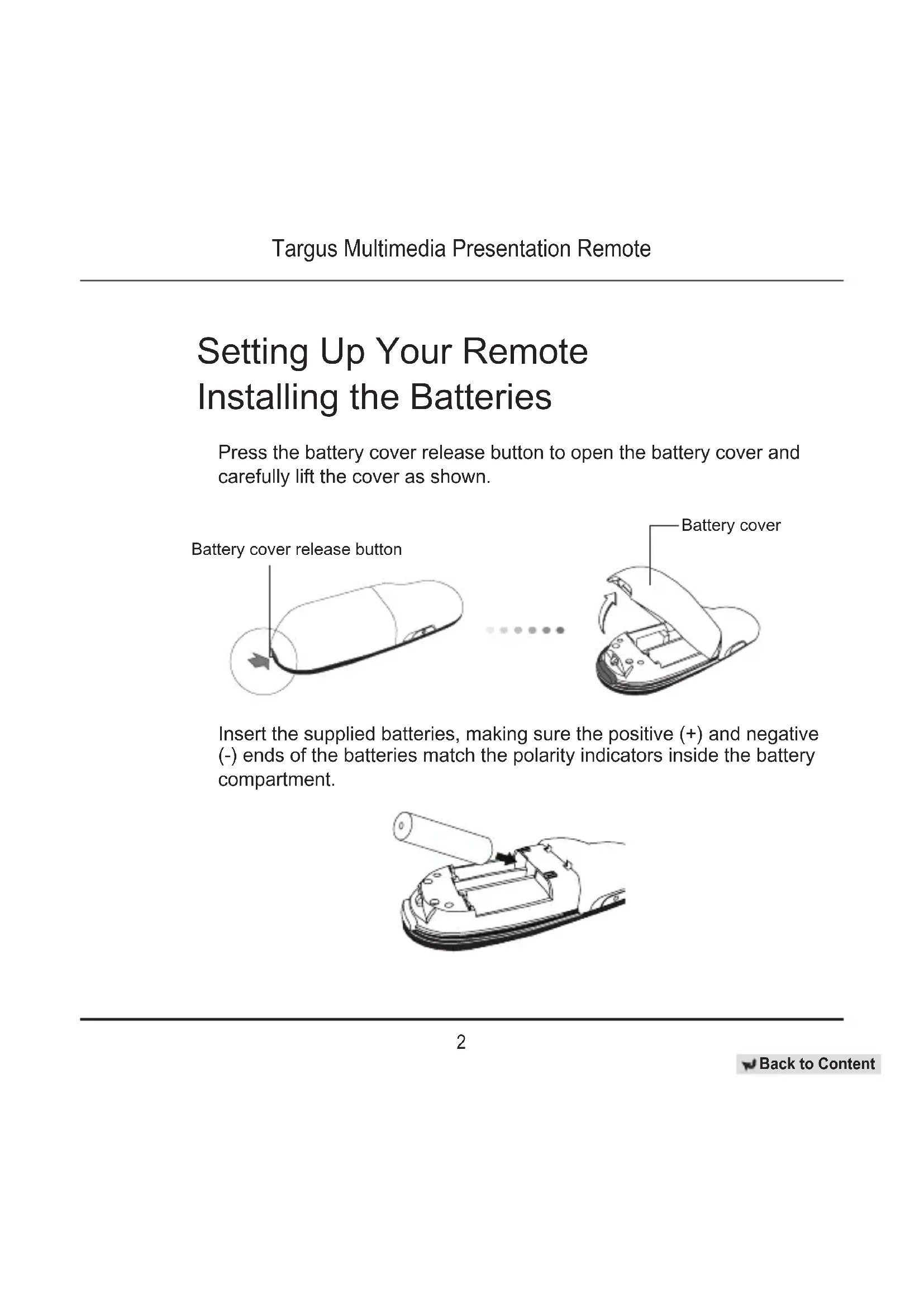 Back to Content Setting Up Your Remote Installing the Batteries Press the battery cover release button to open the battery cover and carefully lift the cover as shown. Battery cover Insert the supplied batteries, making sure the positive (+) and negative (-) ends of the batteries match the polarity indicators inside the battery compartment. Battery cover release buttonTargus Multimedia Presentation Remote