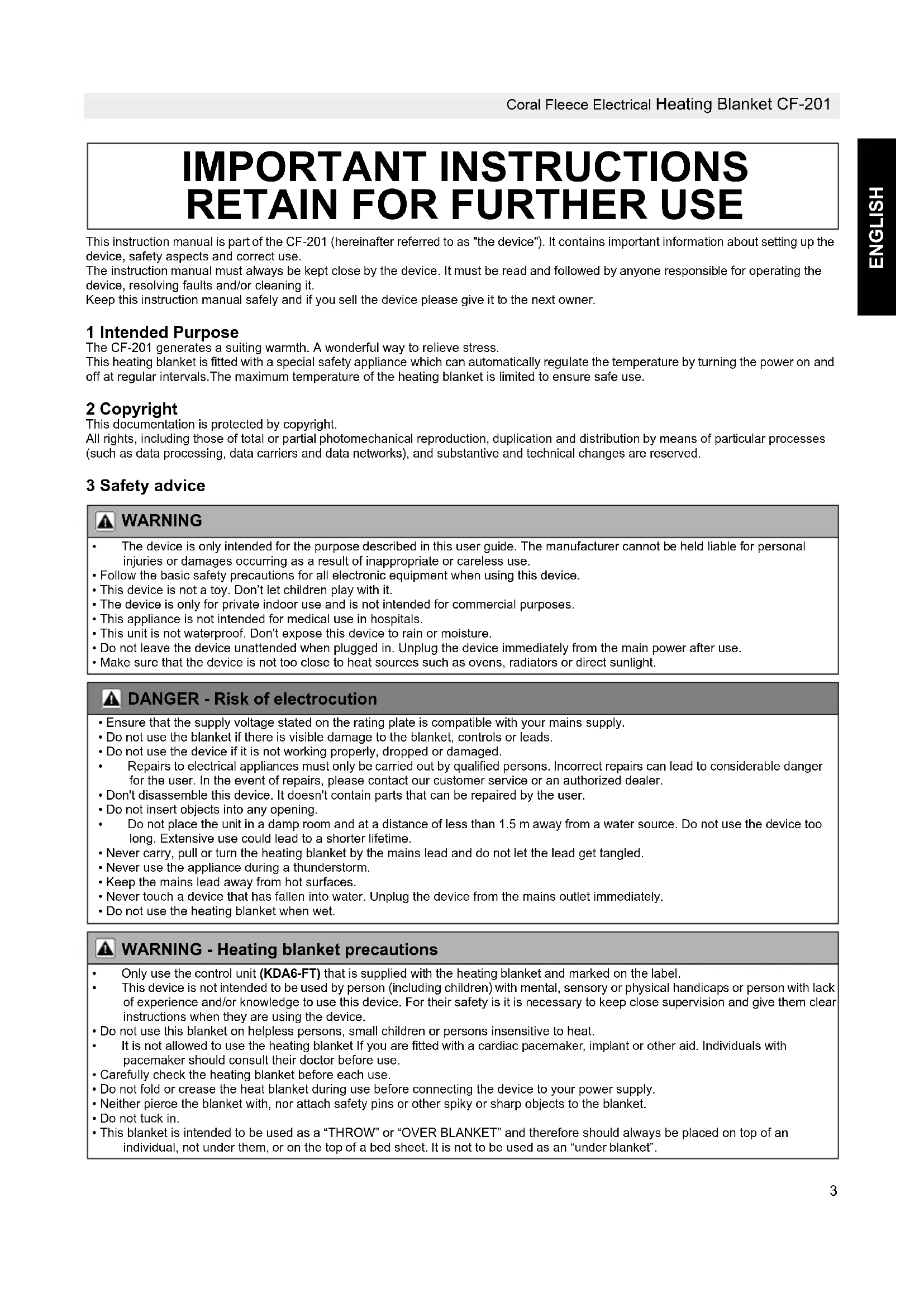 - Only use the control unit (KDA6-FT) that is supplied with the heating blanket and marked on the label.