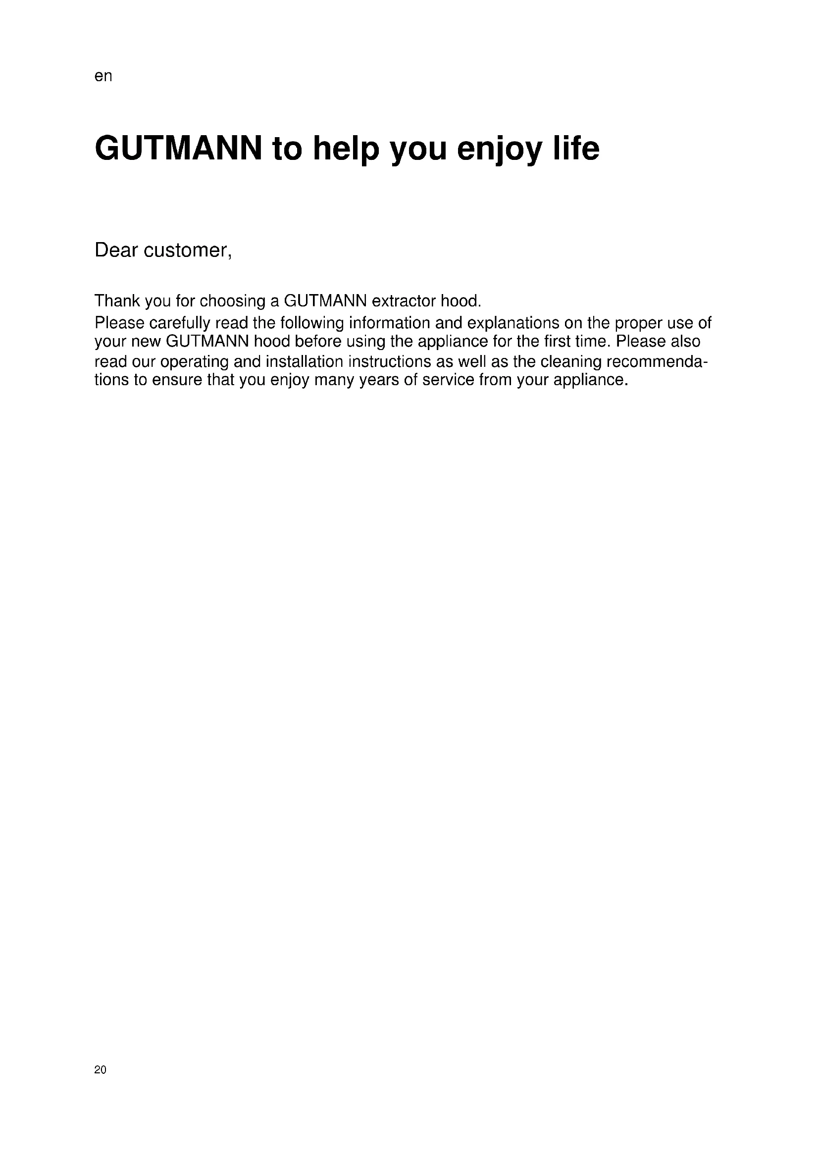 Dear customer, Thank you for choosing a GUTMANN extractor hood. Please carefully read the following information and explanations on the proper use of your new GUTMANN hood before using the appliance for the first time. Please also read our operating and installation instructions as well as the cleaning recommenda- tions to ensure that you enjoy many years of service from your appliance.en