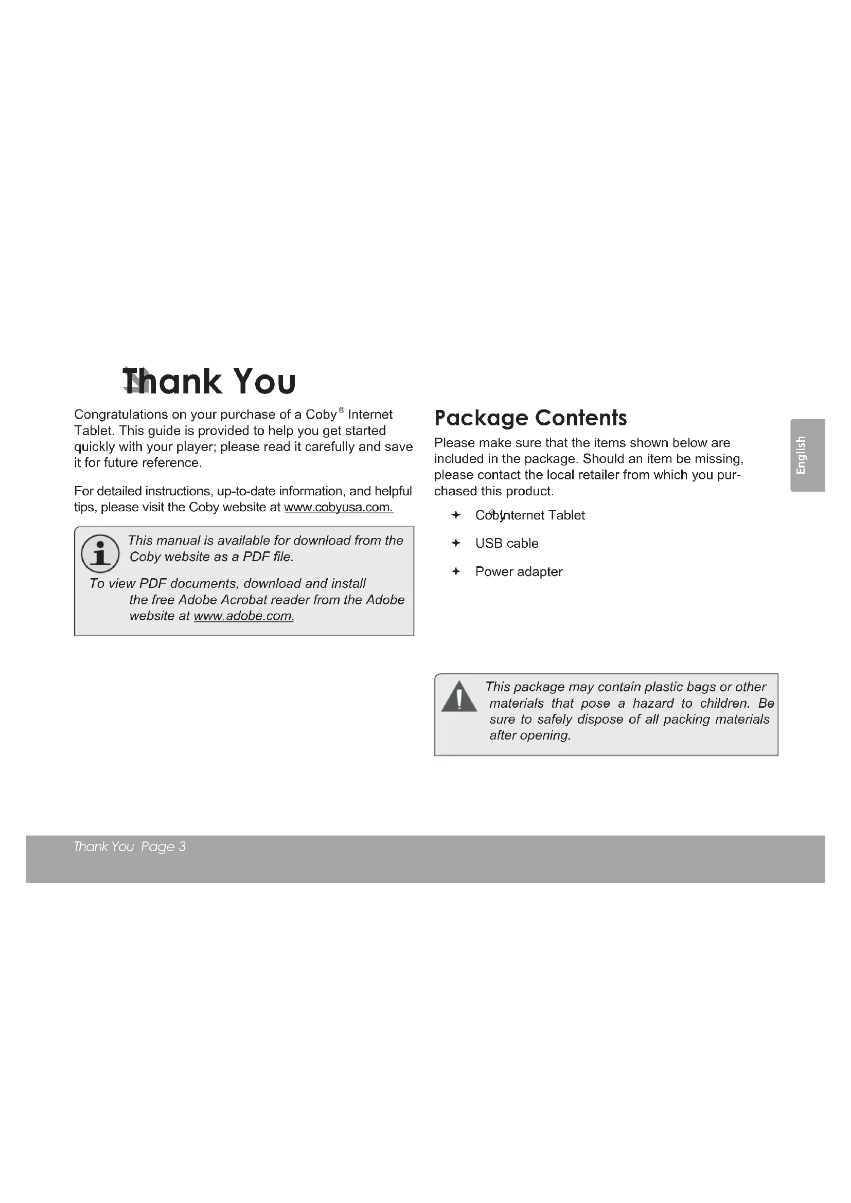Internet Tablet. This guide is provided to help you get started quickly with your player; please read it carefully and save it for future reference. For detailed instructions, up-to-date information, and helpful tips, please visit the Coby website at www.cobyusa.com. This manual is available for download from the Coby website as a PDF le. To view PDF documents, download and install the free Adobe Acrobat reader from the Adobe website at www.adobe.com. package Contents Please make sure that the items shown below are included in the package. Should an item be missing, please contact the local retailer from which you pur- chased this product. Coby