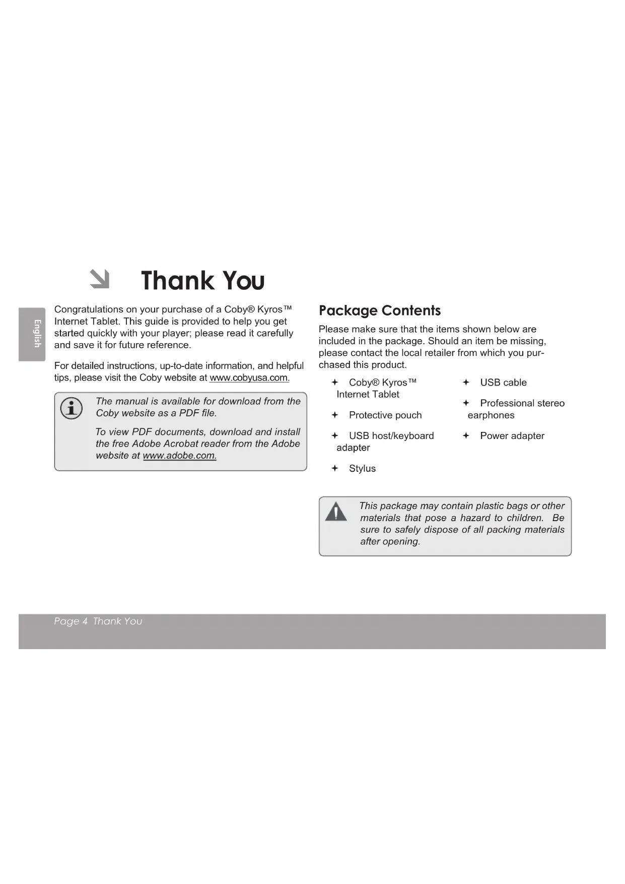 To open an application, touch the application icon on the home screen or in the Launcher. Launcher screen: Thescreenshownaboveisforillusrativepur- posesonly.Cobyreservestherighttomodify andimprovethenallistofapplicationsavail- ableonthetablet. Preinstalled Applications Some applications have been installed on your tablet for your convenience. These applications include: Browse the web. Check your e-mail. View the current time, or set an alarm. View photos and play videos. Play music.Page 18 Getting Started English Launch the mobile YouTube™ browser page to watch internet videos. Download and read thousands of e- books. Supports the ePub standard. Browse for, download, and install applica- tions from the AppsLib store. You can also download an install additional applications from AppsLib, the web browser, or other sources. The tablet must be set to allow installation of applcations from non-Market sources. The Unknown sources option can be set in the Application settings menu. Supportforthird-partyapplicationsisprovidedby theirrespectiveapplicationsdevelopers.Cobyis notresponsibleforthebehavioroftheseapplica- tions;pleasereviewthedescriptionandtermsof useprovidedbythird-partydeveloperscarefully beforeinstallingapplicationsonyourtablet.Page 19 Getting Started English aboutÂMenus There are two types of menus used by the tablet.