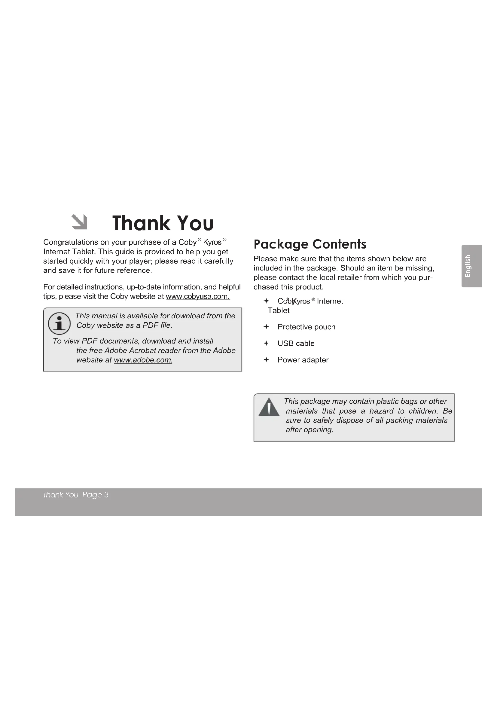 Internet Tablet. This guide is provided to help you get started quickly with your player; please read it carefully and save it for future reference. For detailed instructions, up-to-date information, and helpful tips, please visit the Coby website at www.cobyusa.com. This manual is available for download from the Coby website as a PDF le. To view PDF documents, download and install the free Adobe Acrobat reader from the Adobe website at www.adobe.com. package Contents Please make sure that the items shown below are included in the package. Should an item be missing, please contact the local retailer from which you pur- chased this product. Coby