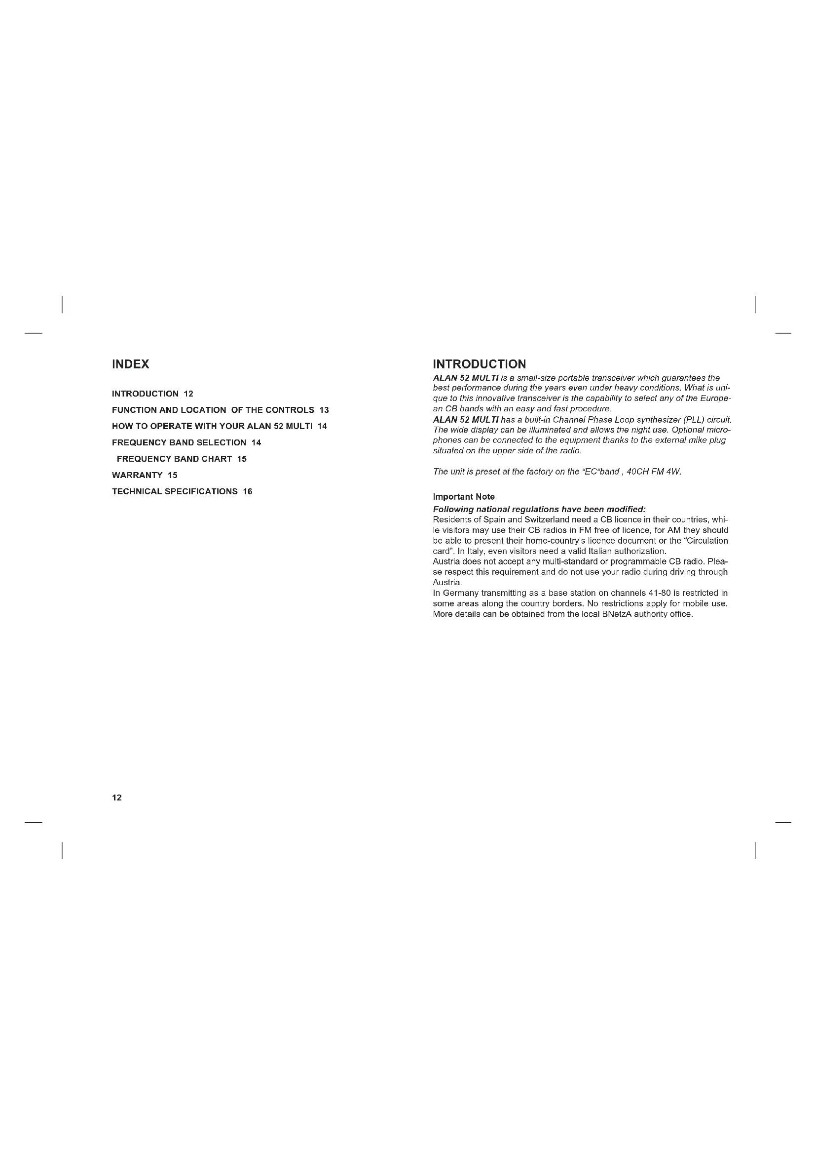 WARRANTY 15 TECHNICAL SPECIFICATIONS 16 INTRODUCTION ALAN 52 MULTI is a small-size portable transceiver which guarantees the best performance during the years even under heavy conditions. What is uni- que to this innovative transceiver is the capability to select any of the Europe- an CB bands with an easy and fast procedure. ALAN 52 MULTI has a built-in Channel Phase Loop synthesizer (PLL) circuit. The wide display can be illuminated and allows the night use. Optional micro- phones can be connected to the equipment thanks to the external mike plug situated on the upper side of the radio. The unit is preset at the factory on the “EC“band , 40CH FM 4W. Important Note Following national regulations have been modified: Residents of Spain and Switzerland need a CB licence in their countries, whi- le visitors may use their CB radios in FM free of licence, for AM they should be able to present their home-country’s licence document or the “Circulation card”. In Italy, even visitors need a valid Italian authorization. Austria does not accept any multi-standard or programmable CB radio. Plea- se respect this requirement and do not use your radio during driving through Austria. In Germany transmitting as a base station on channels 41-80 is restricted in some areas along the country borders. No restrictions apply for mobile use. More details can be obtained from the local BNetzA authority office.13
