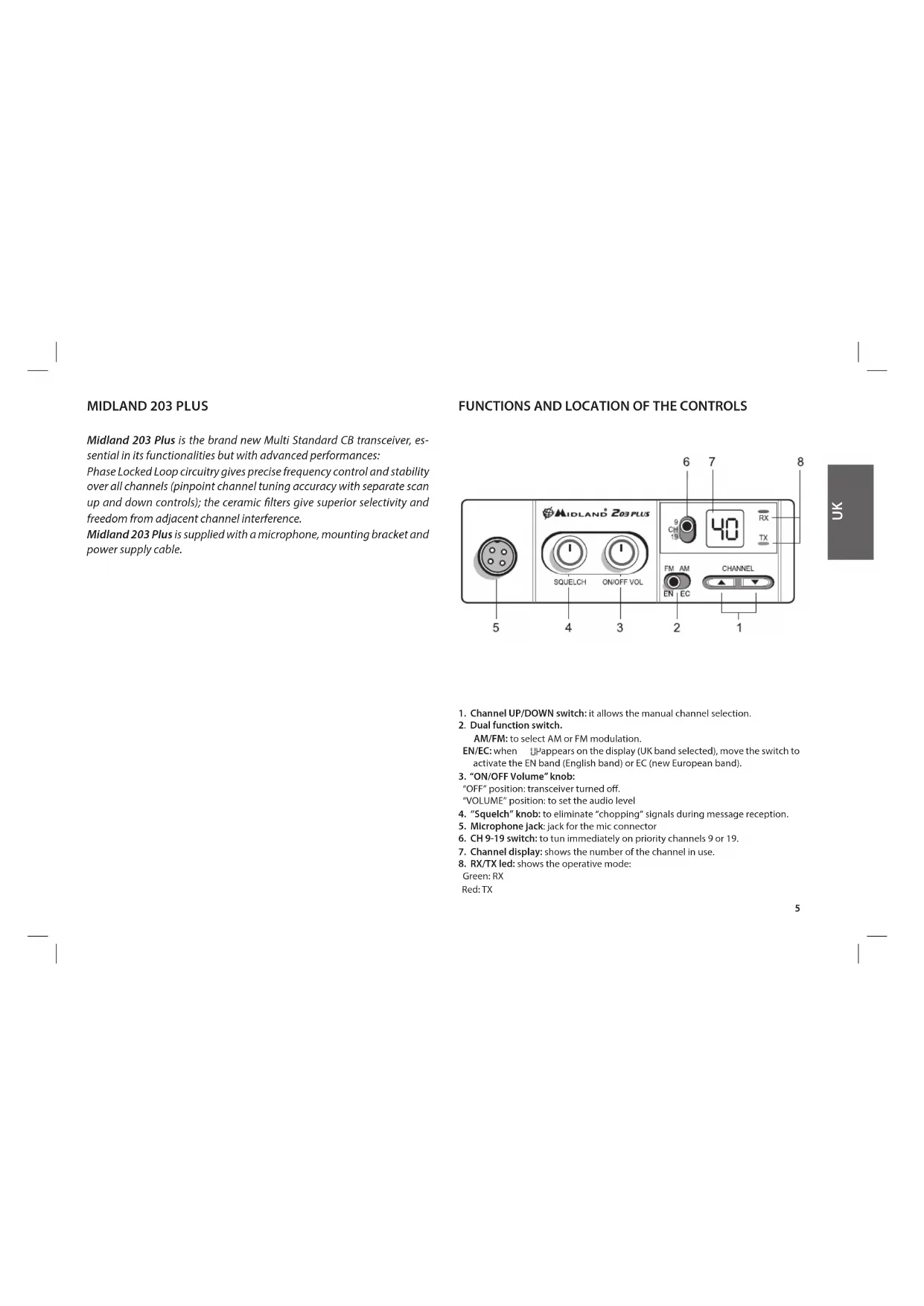 MIDLAND 203 PLUS Midland 203 Plus is the brand new Multi Standard CB transceiver, es- sential in its functionalities but with advanced performances: Phase Locked Loop circuitry gives precise frequency control and stability over all channels (pinpoint channel tuning accuracy with separate scan up and down controls); the ceramic lters give superior selectivity and freedom from adjacent channel interference. Midland 203 Plus is supplied with a microphone, mounting bracket and power supply cable.