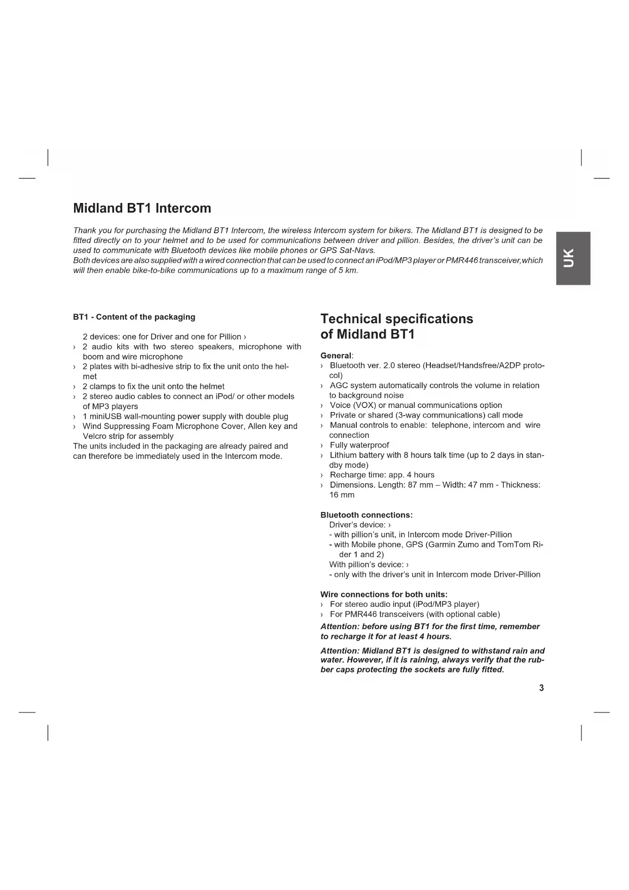 Midland BT1 Intercom Thank you for purchasing the Midland BT1 Intercom, the wireless Intercom system for bikers. The Midland BT1 is designed to be tted directly on to your helmet and to be used for communications between driver and pillion. Besides, the driver’s unit can be used to communicate with Bluetooth devices like mobile phones or GPS Sat-Navs. Both devices are also supplied with a wired connection that can be used to connect an iPod/MP3 player or PMR446 transceiver,which will then enable bike-to-bike communications up to a maximum range of 5 km. BT1 - Content of the packaging 2 devices: one for Driver and one for Pillion › › 2 audio kits with two stereo speakers, microphone with boom and wire microphone › 2 plates with bi-adhesive strip to x the unit onto the hel- met › 2 clamps to x the unit onto the helmet › 2 stereo audio cables to connect an iPod/ or other models of MP3 players › 1 miniUSB wall-mounting power supply with double plug › Wind Suppressing Foam Microphone Cover, Allen key and Velcro strip for assembly The units included in the packaging are already paired and can therefore be immediately used in the Intercom mode. Technical specications of Midland BT1 General: › Bluetooth ver. 2.0 stereo (Headset/Handsfree/A2DP proto- col) › AGC system automatically controls the volume in relation to background noise › Voice (VOX) or manual communications option › Private or shared (3-way communications) call mode › Manual controls to enable: telephone, intercom and wire connection › Fully waterproof › Lithium battery with 8 hours talk time (up to 2 days in stan- dby mode) › Recharge time: app. 4 hours › Dimensions. Length: 87 mm – Width: 47 mm - Thickness: 16 mm Bluetooth connections: Driver’s device: › - with pillion’s unit, in Intercom mode Driver-Pillion - with Mobile phone, GPS (Garmin Zumo and TomTom Ri- der 1 and 2) With pillion’s device: › - only with the driver’s unit in Intercom mode Driver-Pillion Wire connections for both units: › For stereo audio input (iPod/MP3 player) › For PMR446 transceivers (with optional cable) Attention: before using BT1 for the rst time, remember to recharge it for at least 4 hours. Attention: Midland BT1 is designed to withstand rain and water. However, if it is raining, always verify that the rub- ber caps protecting the sockets are fully tted.4 Charging batteries Make sure that the unit is fully charged before use. Allow at least 5-6 hours for a full charge before using the unit for the rst time. Normally, after the rst time, it takes 4 hours for a full charge. Charge the unit by inserting the wall-charger into the charging socket (lift the rubber cover to insert the plug). › The red LED on the unit will start ashing when charging begins. › Allow the headset to charge until the red LED turns off. › When the charge is complete, release the headset from the charger. Description of the unit and installation brackets Description of the BT1 unit The BT1 has 5 multifunction buttons on the front and 3 wired connections in the lower section. Description of the button features: › Telephone (for driver’s unit only): can be used to enable/ disable and manage mobile phone features › Intercom: can be used to enable/disable the Intercom fea- ture › AUX: can be used to enable/disable the wired audio input › Volume+: enables you to increase the volume › Volume -: enables you to decrease the volume Description of the wired connections › Charger jack: enables to recharge the unit using a stan- dard miniUSB power supply › Audio kit jack: enable to connect an audio kit (stereo head- set and microphone) › Auxiliary audio jack (AUX): can be used to connect an audio source, like a stereo iPod/MP3 player or PMR446 transceiver Description of the audio kit The audio system includes two ultra-at stereo speakers and two interchangeable microphones, which are both supplied with a bracket and wire connection. Fixing the stereo speakers. The two stereo speakers have a Velcro/adhesive strip that aids their xing to your helmet. Beware to not completely cover your ear with the speakers, you must always be able to listen to the trafc sound and indication. The microphone can be xed onto the helmet in two ways: Boom Microphone. Place the section with the Velcro/adhe- sive strip between the padding and the rigid cover of the hel- met, so that the microphone is correctly positioned in front of your mouth and that the white symbol is facing your mouth. This type of microphone is suited for Open Faced and Flip Front helmets. Wire microphone. Using the Velcro/adhesive strip, place the microphone inside the helmet in front of your mouth. This type of microphone is more suited for Full Faced helmets. The mini connector on the microphone allows you choose the micro- Charger Audio kit iPod/MP3 PMR446 Phone (for driver’s unit only Intercom AUX Volume + Volume - Red and blue light5