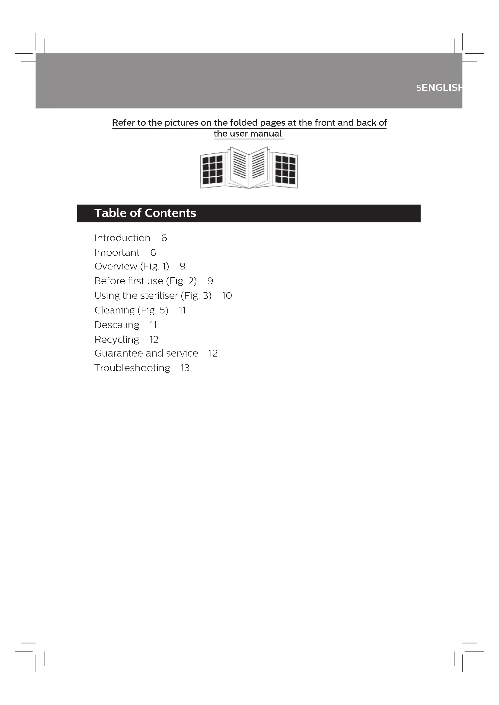 FAl5ENGLISH Table of Contents Introduction 6 Important 6 Overview (Fig. 1) 9 Before rst use (Fig. 2) 9 Using the steriliser (Fig. 3) 10 Cleaning (Fig. 5) 11 Descaling 11 Recycling 12 Guarantee and service 12 Troubleshooting 13 Refer to the pictures on the folded pages at the front and back of the user manual.6 ENGLISH Introduction Congratulations on your purchase and welcome to Philips Avent! To fully benet from the support that Philips Avent oers, register your product at www.philips. com/welcome. Important Read this user manual carefully before you use the appliance and save it for future reference. Danger - Never immerse the base, the mains cord or the mains plug in water or any other liquid. - Failure to follow the descaling instructions may cause irreparable damage. - Never disassemble the base to avoid the risk of electric shock. Warning - This appliance shall not be used by children. Keep the appliance and its cord out of reach of children. - This appliance can be used by persons with reduced physical, sensory or mental capabilities or lack of experience and knowledge if they have been given supervision or instruction concerning use of the appliance in a safe way and understand the hazards involved. - Children shall not play with the appliance. - Check if the voltage indicated on the appliance corresponds to the local mains voltage before you connect the appliance. - Only connect the appliance to an earthed wall socket, and make sure the plug is rmly inserted in the wall socket. Keep the mains cord away from hot surfaces. - Do not use the appliance if the plug, the mains cord or the appliance itself is damaged. - If the mains cord is damaged, it must be replaced by Philips Avent, a service centre authorised by Philips7ENGLISH Avent or similarly qualied persons in order to avoid a hazard. - There are no serviceable parts inside the electric steam steriliser. Do not attempt to open, service or repair the electric steam steriliser by yourself. - The appliance becomes very hot during sterilisation and may cause burns if it is touched. - Beware of hot steam that comes out of the vent in the lid or when you remove the lid. Steam can cause burns. - Do not touch the base, the baskets and the lid during or shortly after sterilisation to avoid getting burnt. Only lift the lid by its grip. - Never move or open the appliance when it is in use or before it has cooled down. - Never place items on top of the appliance when it is in use. - Only use water without any additives for sterilisation. Recommend to use puried water to decrease limescale. - Only use white vinegar according to the user manual when descaling. Do not put bleach or other chemicals in the appliance. - Only sterilise baby bottles and other items that are suitable for steam sterilisers. Check the user manual of the items you want to sterilise, to make sure they are suitable for steam sterilisers. - To stop the sterilisation under urgent circumstances, press the power-o button, and unplug the appliance. Sterilising for a shorter period of time may aect the sterilisation ecacy. - The heating plate surface is subject to residual heat after use. Be careful not to get burnt by it. - This appliance is intended for household use only. - Do not use abrasive or aggressive cleaning agents (e.g. bleach) or a scouring pad to clean this appliance.8 ENGLISH Caution - Never use any accessories or parts from other manufacturers or that Philips Avent does not specically recommend. If you use such accessories or parts, your guarantee becomes invalid. - The appliance is intended to be used indoors. Do not expose it to extreme heat or direct sunlight. - Always unplug the appliance and let it cool down before moving or storing it. - Do not sterilise very small items which can fall through the holes to the heating plate. - Never place items directly on the heating plate when the appliance is switched on. - Do not use the appliance if it has fallen or is damaged in any way. Take it to an authorised Philips Avent service centre for repair. - Always place and use the appliance on a dry, stable, level and horizontal surface. - Do not place the appliance on a hot surface. - Do not let the mains cord hang over the edge of the table or worktop on which the appliance stands. - Pour any remaining water out of the appliance after use and when the appliance has cooled down. - Always unplug the appliance after use. - Environmental conditions, such as altitude above 2500 meters, may aect the sterilising performance of this appliance. - Switch o the appliance and disconnect from supply before changing accessories or approaching parts that move in use. - Cleaning and user maintenance shall not be made by children. - Always disconnect the device from supply if it’s left unattended. Electromagnetic elds (EMF) This Philips appliance complies with all applicable standards and regulations regarding exposure to electromagnetic elds.9ENGLISH Overview (Fig. 1) a Lid b Small basket c Big basket d Heating plate e Base f Power-on indicator g Power-on button “I” h Power-off button “O” i Mains cord Before first use (Fig. 2) When you use the appliance for the rst time, we advise you to let it complete one sterilisation process with empty baskets. 1 Use a baby bottle and pour 90ml/3 uid oz puried water or tap water directly into the heating plate. (Fig. 2-1) 2 Place the big basket on the base. Adjust the position of the big basket so that it ts properly on the base. (Fig. 2-2) 3 Place the small basket in the big basket. Adjust the position of the small basket so that it ts properly in the big basket. (Fig. 2-3) 4 Place the lid on top of the small basket. Adjust the position of the lid so that it ts properly on the small basket. (Fig. 2-4) 5 Put the plug in the wall socket. (Fig. 2-5) 6 Press the power-on button to switch on the appliance. (Fig. 2-6) » The power-on indicator lights up to indicate that the appliance starts operating. » A sterilising cycle takes around 1