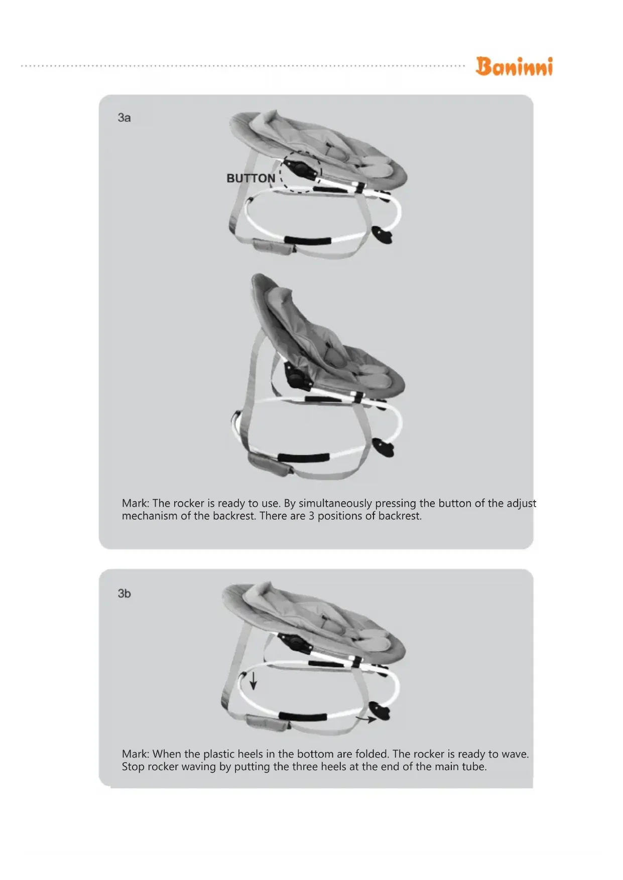 Mark: The rocker is ready to use. By simultaneously pressing the button of the adjust mechanism of the backrest. There are 3 positions of backrest.