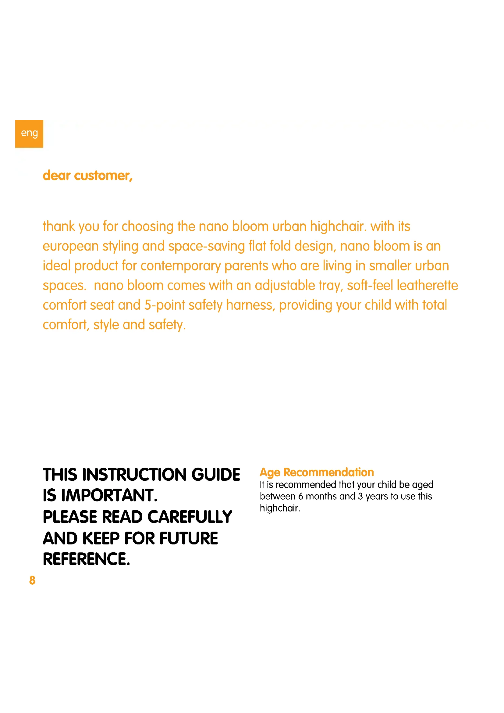thank you for choosing the nano bloom urban highchair. with its european styling and space-saving flat fold design, nano bloom is an ideal product for contemporary parents who are living in smaller urban spaces. nano bloom comes with an adjustable tray, soft-feel leatherette comfort seat and 5-point safety harness, providing your child with total comfort, style and safety.