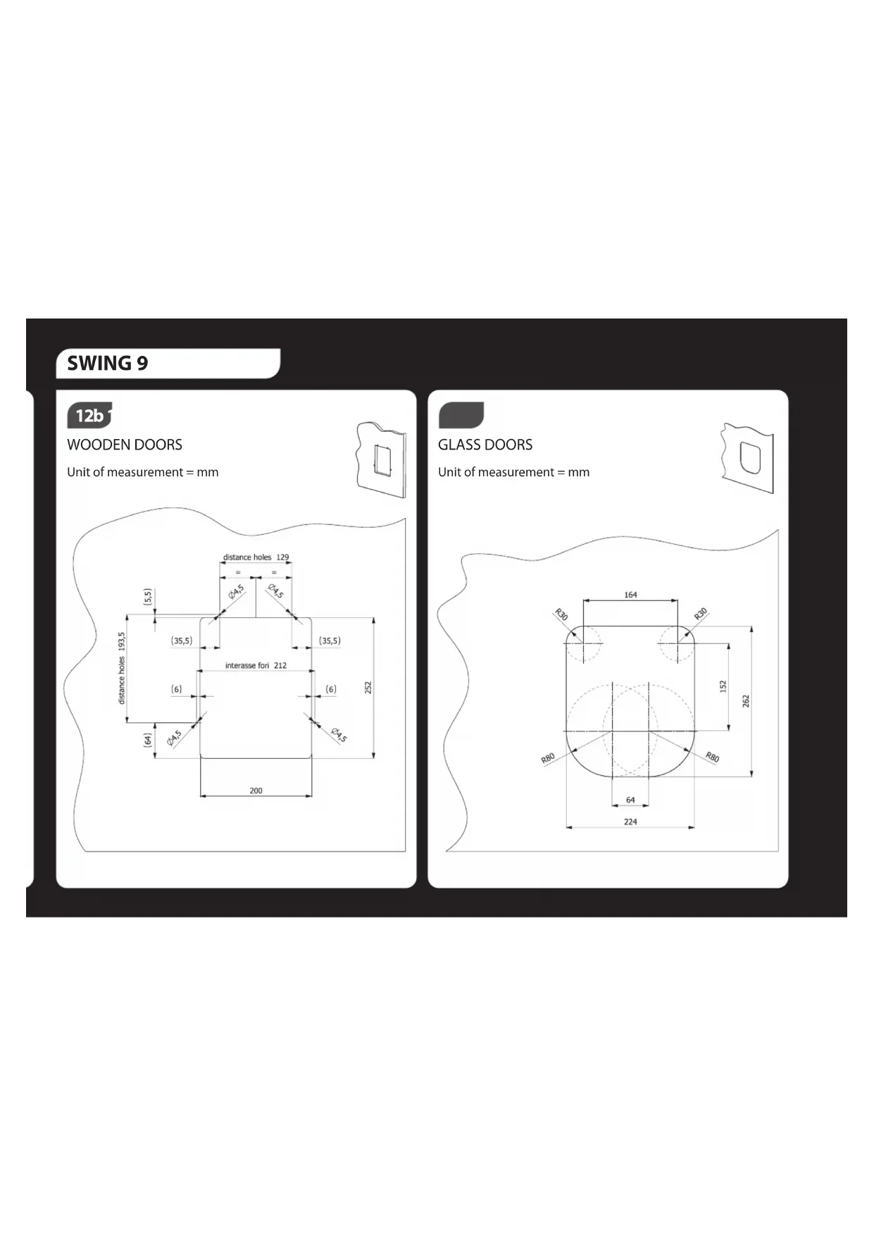 6c drill four circular holes in the four corners of the pet flap, if it is SWING 9, SWING 11 or SWING 15. Then cut the tangents of the 4 holes to obtain a unique opening on the glass. (The centre of the holes are marked on the template). 13b/c/d
