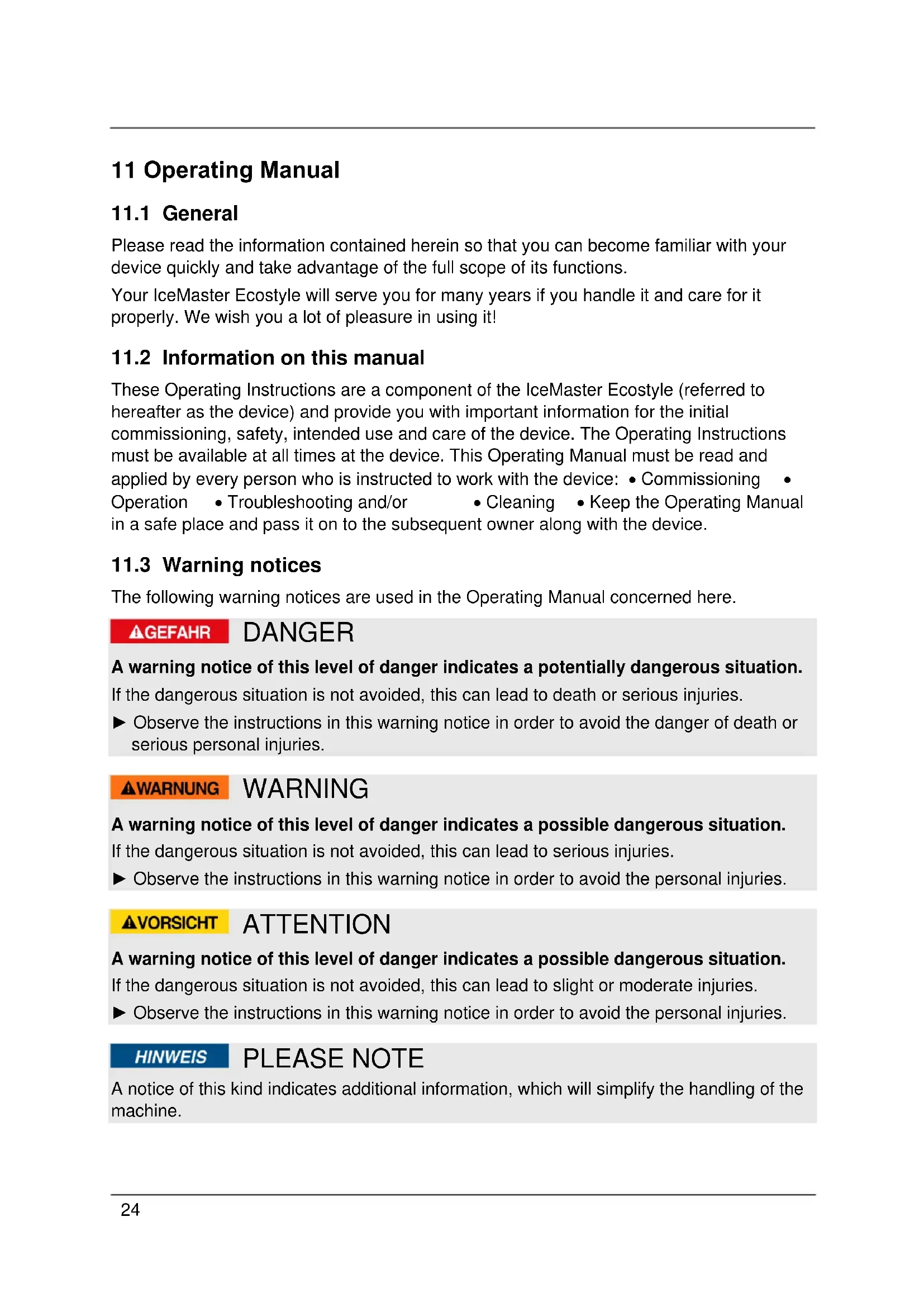 The following warning notices are used in the Operating Manual concerned here. DANGER A warning notice of this level of danger indicates a potentially dangerous situation. If the dangerous situation is not avoided, this can lead to death or serious injuries. ► Observe the instructions in this warning notice in order to avoid the danger of death or serious personal injuries. WARNING A warning notice of this level of danger indicates a possible dangerous situation. If the dangerous situation is not avoided, this can lead to serious injuries. ► Observe the instructions in this warning notice in order to avoid the personal injuries. ATTENTION A warning notice of this level of danger indicates a possible dangerous situation. If the dangerous situation is not avoided, this can lead to slight or moderate injuries. ► Observe the instructions in this warning notice in order to avoid the personal injuries. PLEASE NOTE A notice of this kind indicates additional information, which will simplify the handling of the machine.25 12 Safety This chapter provides you with important safety notices when handling the device. The device corresponds with the required safety regulations. Improper use can result in personal or property damages.
