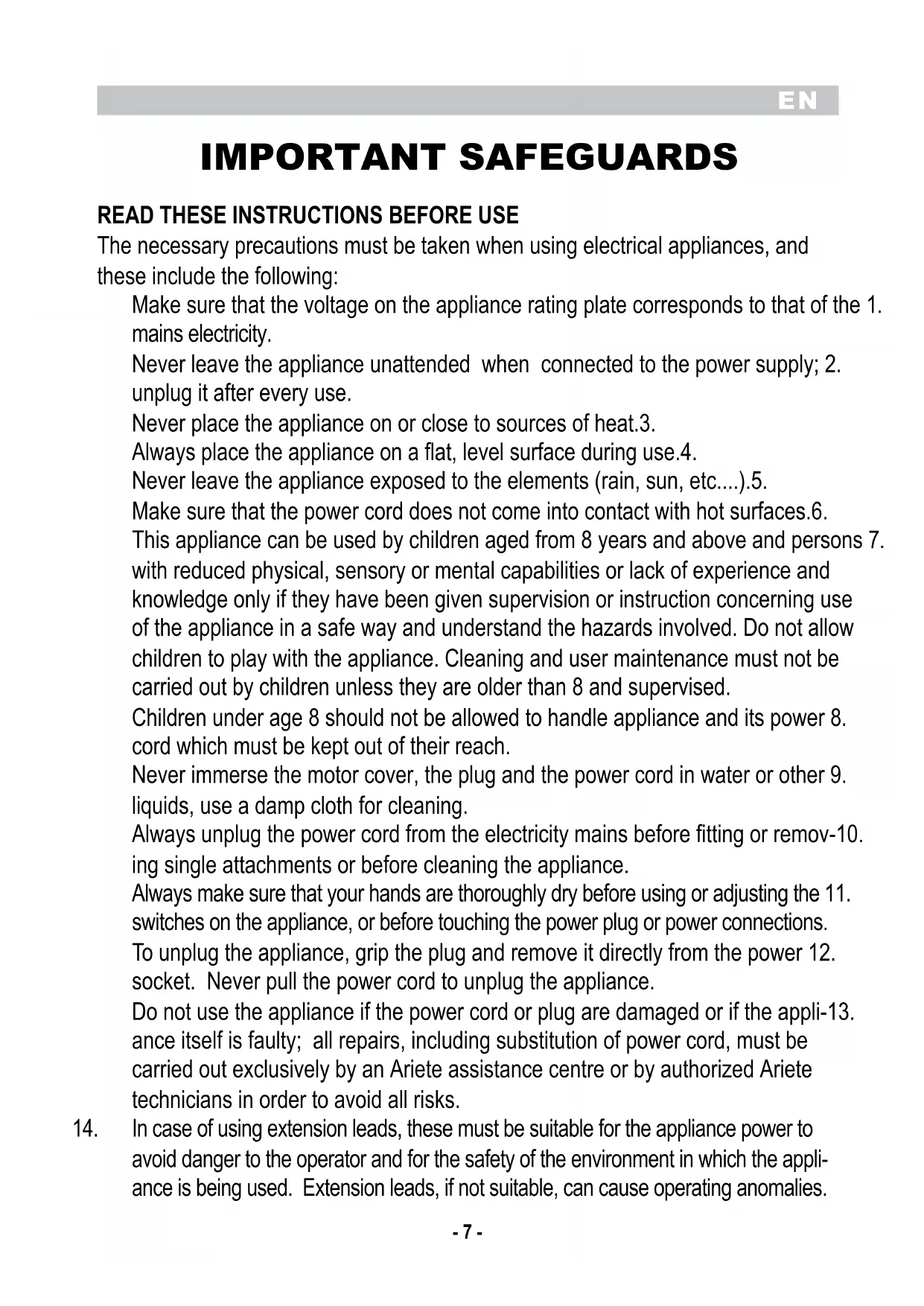 The necessary precautions must be taken when using electrical appliances, and these include the following: Make sure that the voltage on the appliance rating plate corresponds to that of the 1. mains electricity. Never leave the appliance unattended when connected to the power supply; 2. unplug it after every use. Never place the appliance on or close to sources of heat.3. Always place the appliance on a flat, level surface during use.4. Never leave the appliance exposed to the elements (rain, sun, etc....).5. Make sure that the power cord does not come into contact with hot surfaces.6. This appliance can be used by children aged from 8 years and above and persons 7. with reduced physical, sensory or mental capabilities or lack of experience and knowledge only if they have been given supervision or instruction concerning use of the appliance in a safe way and understand the hazards involved. Do not allow children to play with the appliance. Cleaning and user maintenance must not be carried out by children unless they are older than 8 and supervised. Children under age 8 should not be allowed to handle appliance and its power 8. cord which must be kept out of their reach. Never immerse the motor cover, the plug and the power cord in water or other 9. liquids, use a damp cloth for cleaning. Always unplug the power cord from the electricity mains before fitting or remov-10. ing single attachments or before cleaning the appliance. Always make sure that your hands are thoroughly dry before using or adjusting the 11. switches on the appliance, or before touching the power plug or power connections. To unplug the appliance, grip the plug and remove it directly from the power 12. socket. Never pull the power cord to unplug the appliance. Do not use the appliance if the power cord or plug are damaged or if the appli-13. ance itself is faulty; all repairs, including substitution of power cord, must be carried out exclusively by an Ariete assistance centre or by authorized Ariete technicians in order to avoid all risks. In case of using extension leads, these must be suitable for the appliance power to 14. avoid danger to the operator and for the safety of the environment in which the appli- ance is being used. Extension leads, if not suitable, can cause operating anomalies.EN