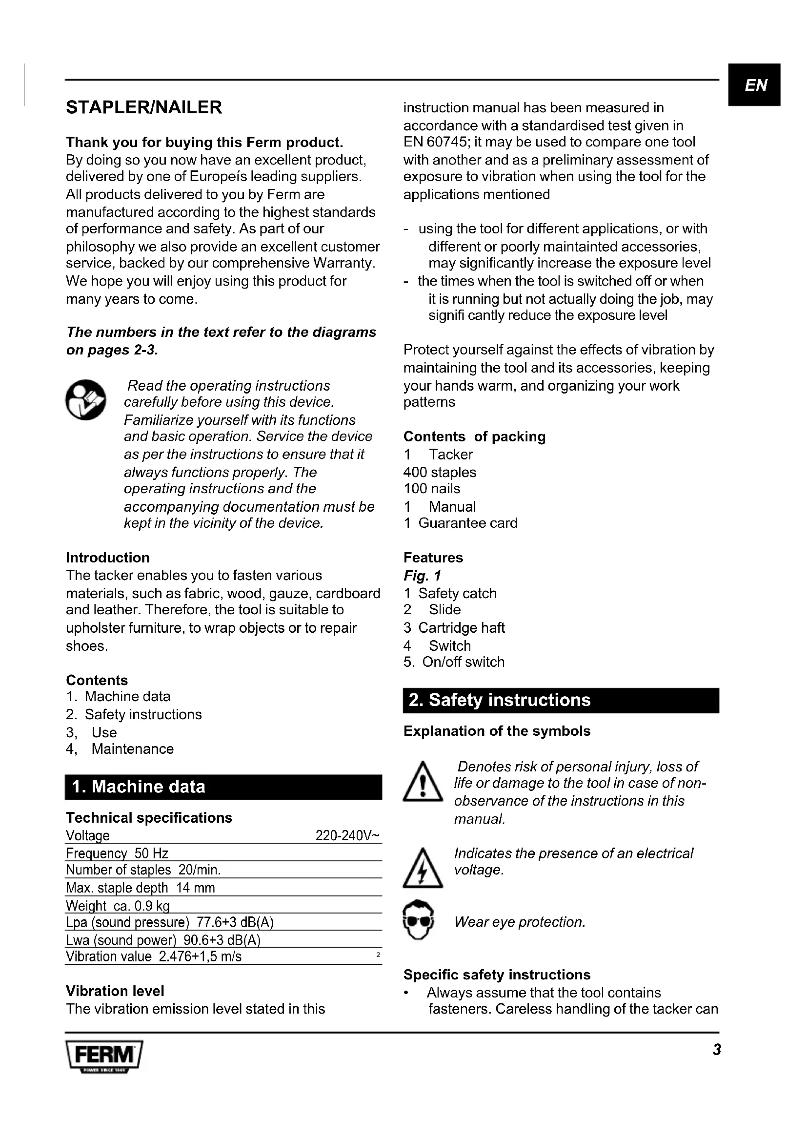 Download the instructions for your Stapler in PDF format for free! Find your manual ETM1003 - Ferm and take your electronic device back in hand. On this page are published all the documents necessary for the use of your device. ETM1003 by Ferm.