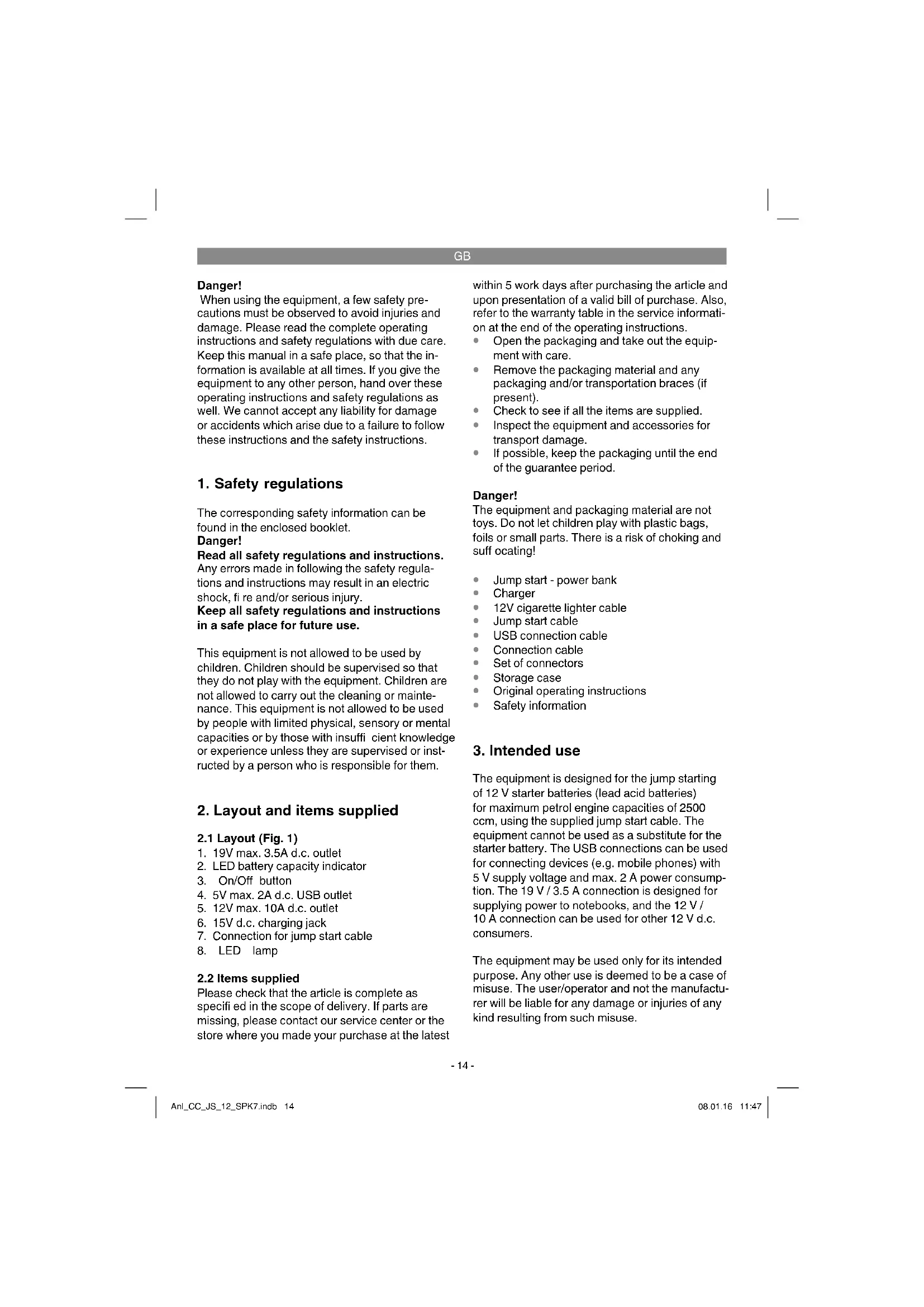 The equipment is designed for the jump starting of 12 V starter batteries (lead acid batteries) for maximum petrol engine capacities of 2500 ccm, using the supplied jump start cable. The equipment cannot be used as a substitute for the starter battery. The USB connections can be used for connecting devices (e.g. mobile phones) with 5 V supply voltage and max. 2 A power consump- tion. The 19 V / 3.5 A connection is designed for supplying power to notebooks, and the 12 V / 10 A connection can be used for other 12 V d.c. consumers. The equipment may be used only for its intended purpose. Any other use is deemed to be a case of misuse. The user/operator and not the manufactu- rer will be liable for any damage or injuries of any kind resulting from such misuse. Anl_CC_JS_12_SPK7.indb 14Anl_CC_JS_12_SPK7.indb 14 08.01.16 11:4708.01.16 11:47GB
