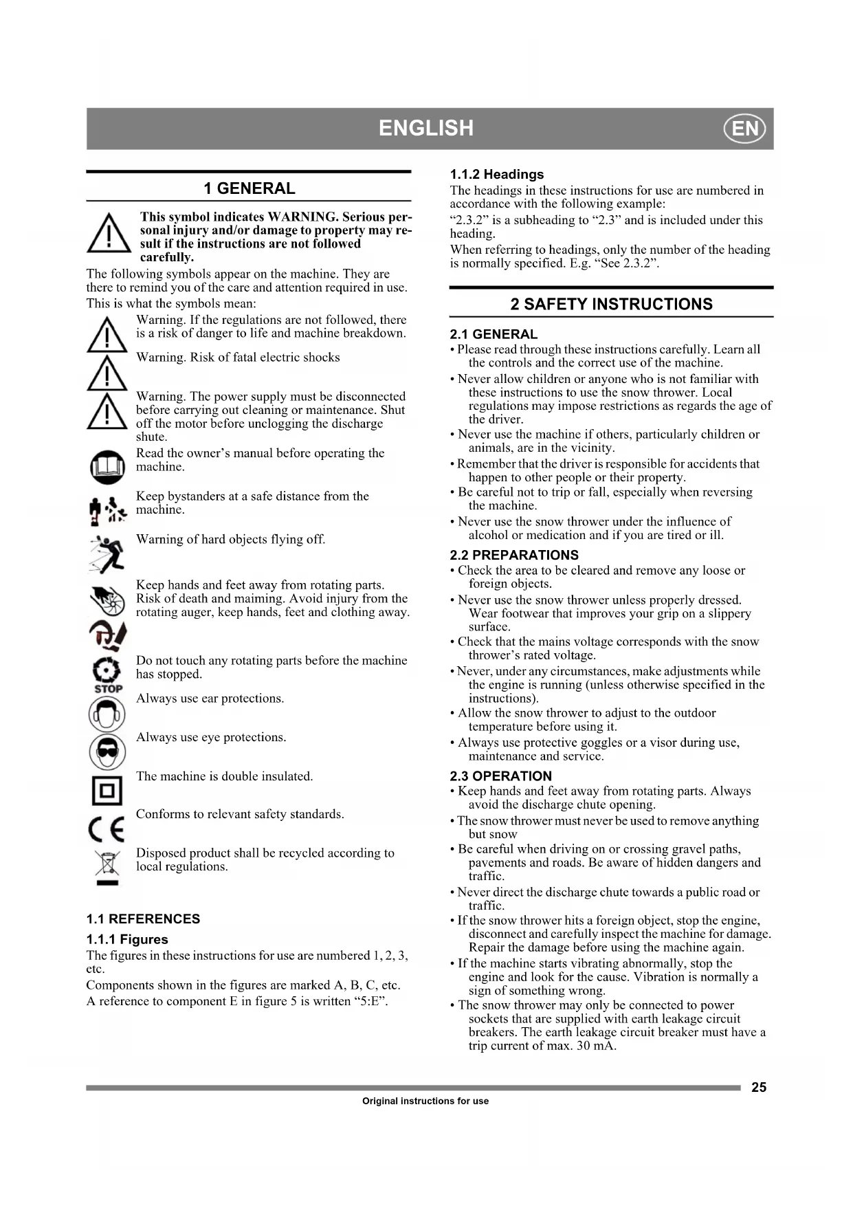 Original instructions for use 1 GENERAL This symbol indicates WARNING. Serious per- sonal injury and/or damage to property may re- sult if the instructions are not followed carefully. The following symbols appear on the machine. They are there to remind you of the care and attention required in use. This is what the symbols mean: Warning. If the regulations are not followed, there is a risk of danger to life and machine breakdown. Warning. Risk of fatal electric shocks Warning. The power supply must be disconnected before carrying out cleaning or maintenance. Shut off the motor before unclogging the discharge shute. Read the owner’s manual before operating the machine. Keep bystanders at a safe distance from the machine. Warning of hard objects flying off. Keep hands and feet away from rotating parts. Risk of death and maiming. Avoid injury from the rotating auger, keep hands, feet and clothing away. Do not touch any rotating parts before the machine has stopped. Always use ear protections. Always use eye protections. The machine is double insulated. Conforms to relevant safety standards. Disposed product shall be recycled according to local regulations.