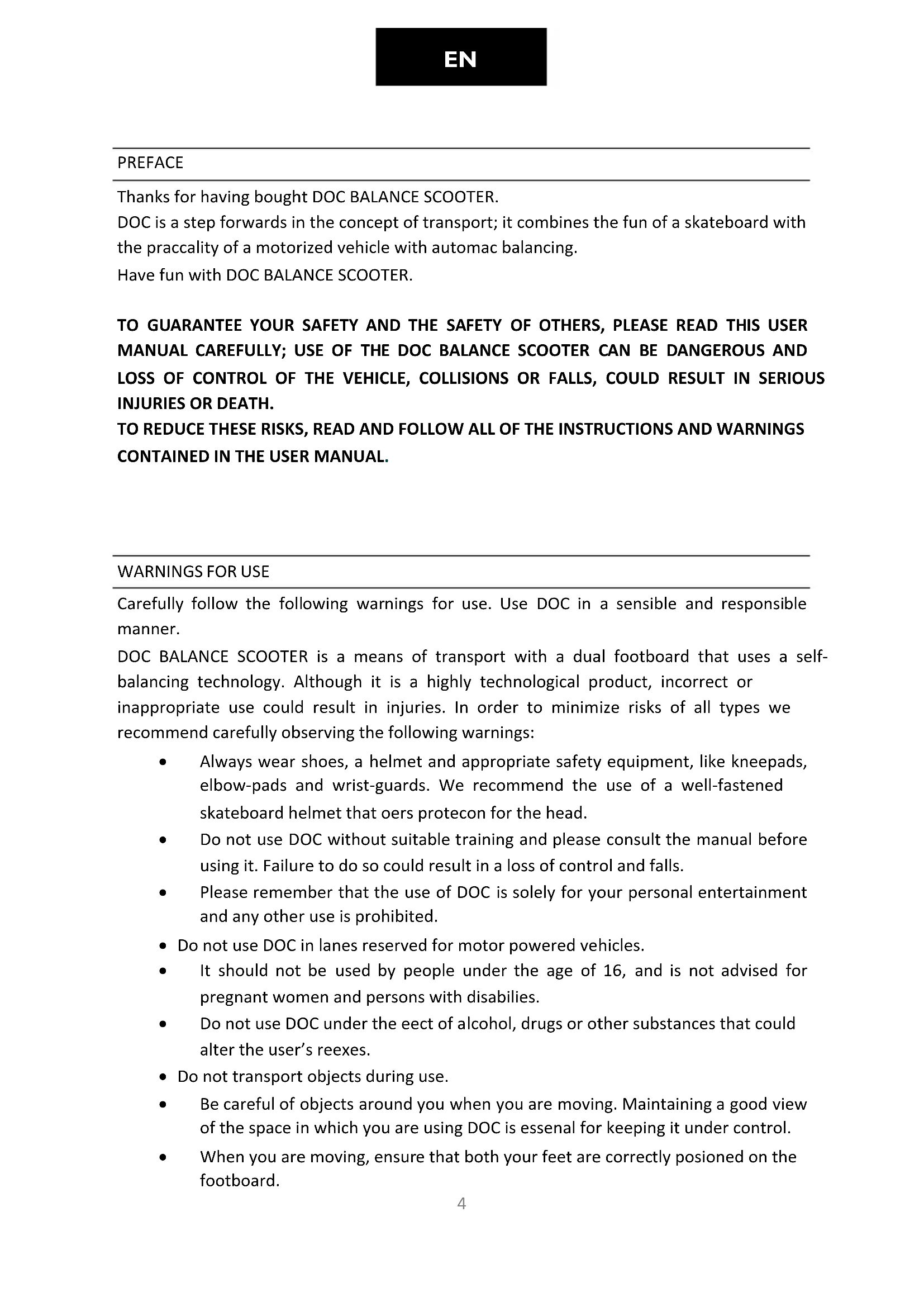 Carefully follow the following warnings for use. Use DOC in a sensible and responsible manner. DOC BALANCE SCOOTER is a means of transport with a dual footboard that uses a self- balancing technology. Although it is a highly technological product, incorrect or inappropriate use could result in injuries. In order to minimize risks of all types we recommend carefully observing the following warnings: Always wear shoes, a helmet and appropriate safety equipment, like kneepads, elbow-pads and wrist-guards. We recommend the use of a well-fastened skateboard helmet that offers protection for the head. Do not use DOC without suitable training and please consult the manual before using it. Failure to do so could result in a loss of control and falls. Please remember that the use of DOC is solely for your personal entertainment and any other use is prohibited. Do not use DOC in lanes reserved for motor powered vehicles. It should not be used by people under the age of 16, and is not advised for pregnant women and persons with disabilities. Do not use DOC under the effect of alcohol, drugs or other substances that could alter the user’s reflexes. Do not transport objects during use. Be careful of objects around you when you are moving. Maintaining a good view of the space in which you are using DOC is essential for keeping it under control. When you are moving, ensure that both your feet are correctly positioned on the footboard.5