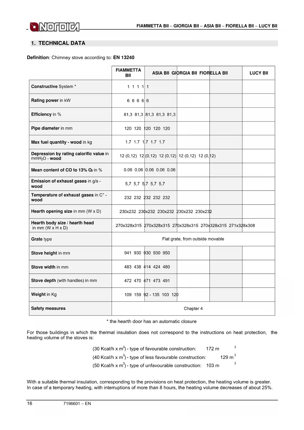 With a suitable thermal insulation, corresponding to the provisions on heat protection, the heating volume is greater. In case of a temporary heating, with interruptions of more than 8 hours, the heating volume decreases of about 25%.FIAMMETTA BII – GIORGIA BII – ASIA BII – FIORELLA BII – LUCY BII 7196601 – EN 17