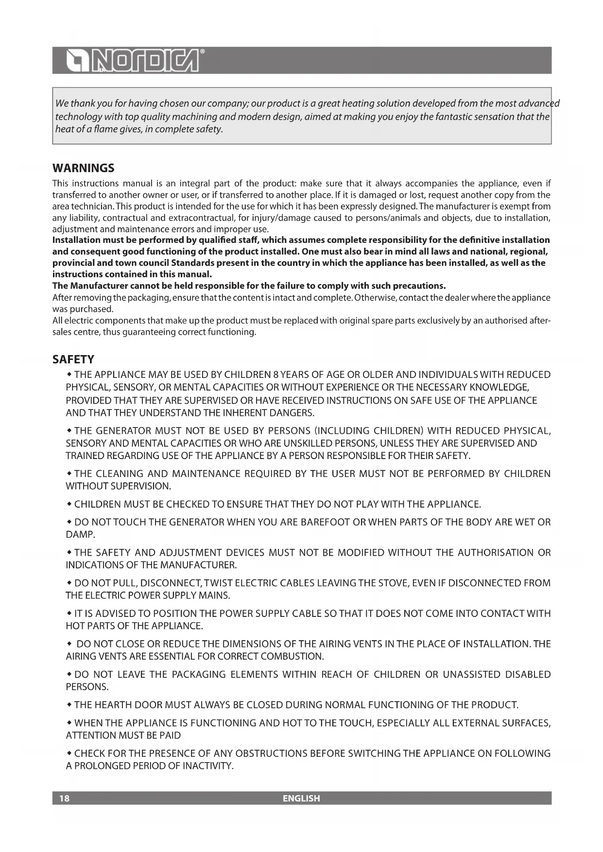 La NORDICA S.p.A. responsibility is limited to the supply of the appliance.