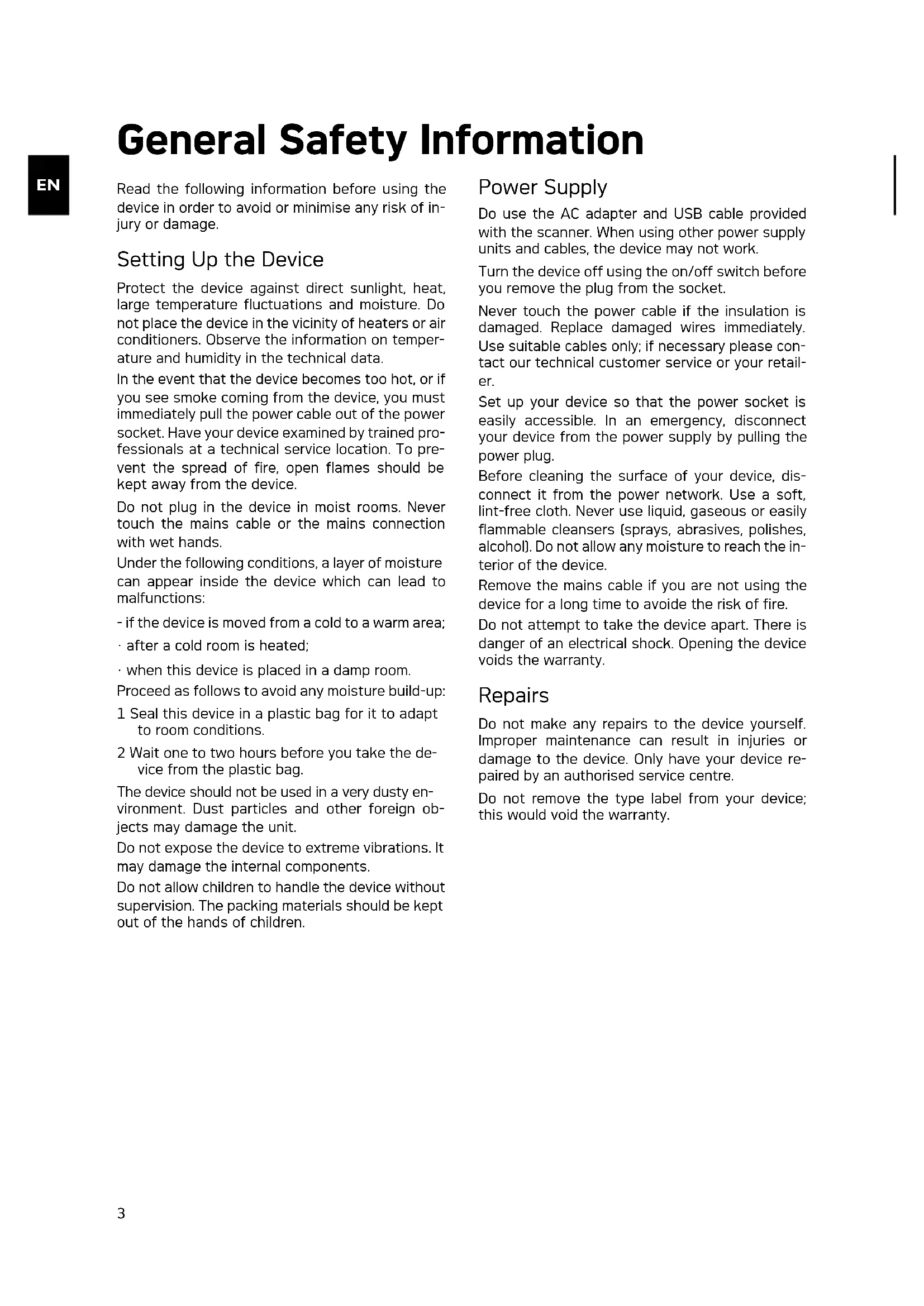 Do use the AC adapter and USB cable provided with the scanner. When using other power supply units and cables, the device may not work.