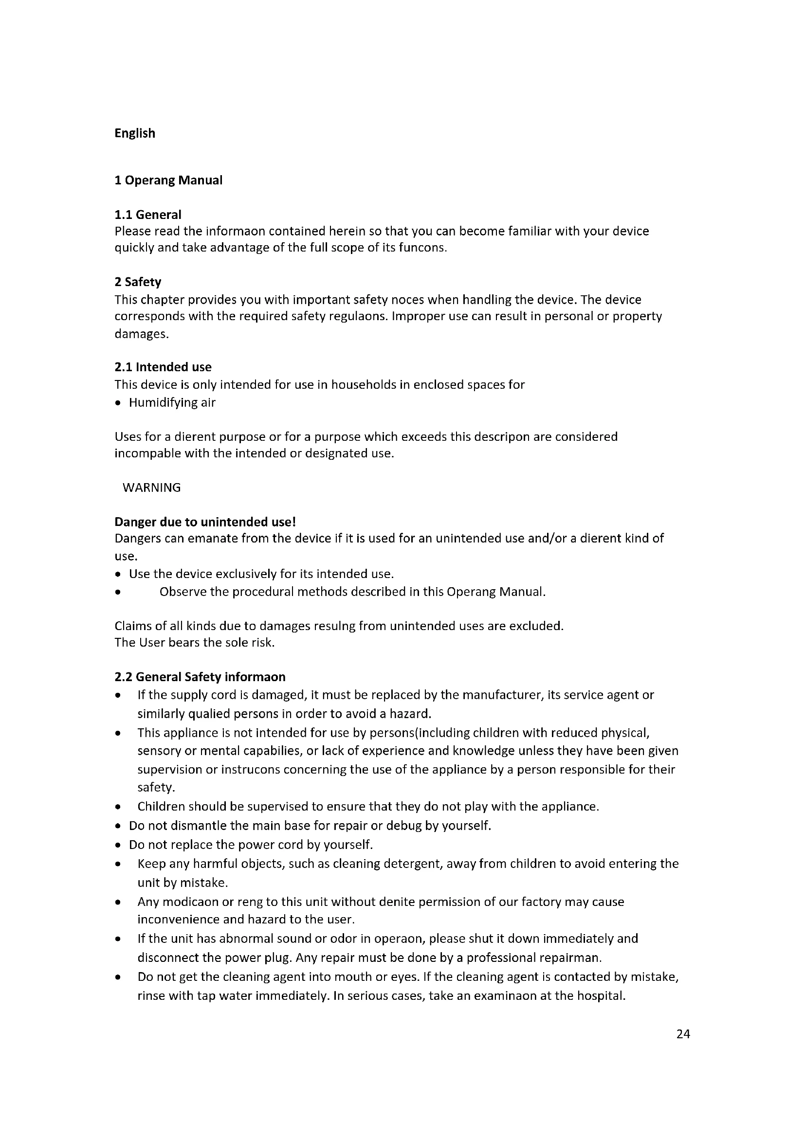 This device is only intended for use in households in enclosed spaces for Humidifying air Uses for a different purpose or for a purpose which exceeds this description are considered incompatible with the intended or designated use. WARNING Danger due to unintended use! Dangers can emanate from the device if it is used for an unintended use and/or a different kind of use. Use the device exclusively for its intended use. Observe the procedural methods described in this Operating Manual. Claims of all kinds due to damages resulting from unintended uses are excluded. The User bears the sole risk.