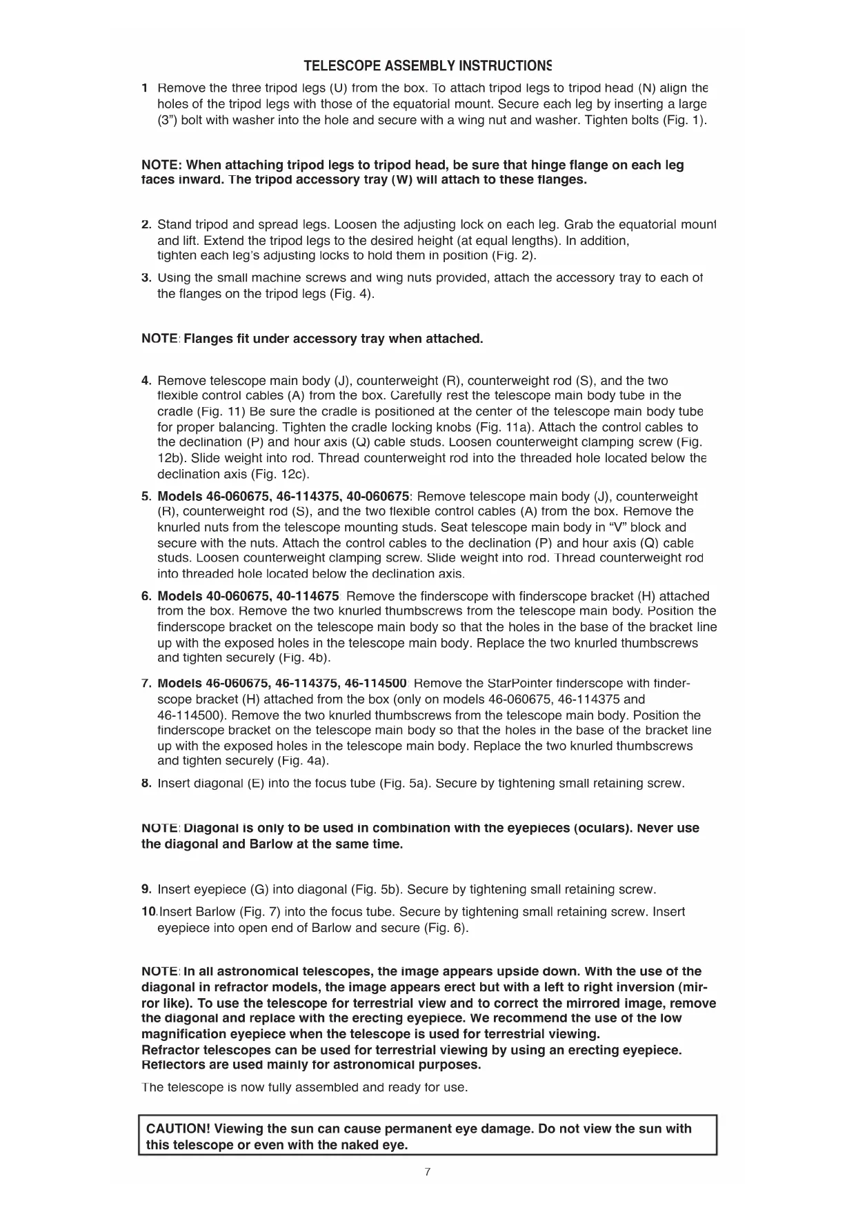Insert Barlow (Fig. 7) into the focus tube. Secure by tightening small retaining screw. Insert eyepiece into open end of Barlow and secure (Fig. 6). NOTE: In all astronomical telescopes, the image appears upside down. With the use of the diagonal in refractor models, the image appears erect but with a left to right inversion (mir- ror like). To use the telescope for terrestrial view and to correct the mirrored image, remove the diagonal and replace with the erecting eyepiece. We recommend the use of the low magnification eyepiece when the telescope is used for terrestrial viewing. Refractor telescopes can be used for terrestrial viewing by using an erecting eyepiece. Reflectors are used mainly for astronomical purposes. The telescope is now fully assembled and ready for use. CAUTION! Viewing the sun can cause permanent eye damage. Do not view the sun with this telescope or even with the naked eye.8