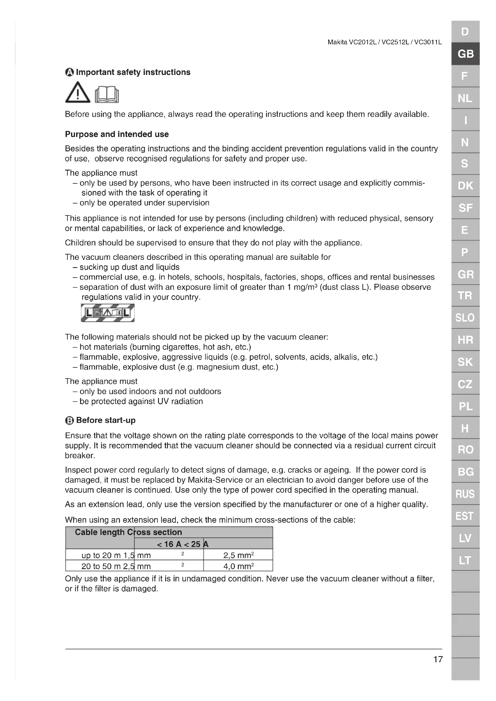 Makita VC2012L / VC2512L / VC3011L Important safety instructions Before using the appliance, always read the operating instructions and keep them readily available. Purpose and intended use Besides the operating instructions and the binding accident prevention regulations valid in the country of use, observe recognised regulations for safety and proper use. The appliance must – only be used by persons, who have been instructed in its correct usage and explicitly commis- sioned with the task of operating it – only be operated under supervision This appliance is not intended for use by persons (including children) with reduced physical, sensory or mental capabilities, or lack of experience and knowledge. Children should be supervised to ensure that they do not play with the appliance. The vacuum cleaners described in this operating manual are suitable for – sucking up dust and liquids – commercial use, e.g. in hotels, schools, hospitals, factories, shops, offices and rental businesses – separation of dust with an exposure limit of greater than 1 mg/m³ (dust class L). Please observe regulations valid in your country. The following materials should not be picked up by the vacuum cleaner: – hot materials (burning cigarettes, hot ash, etc.) – flammable, explosive, aggressive liquids (e.g. petrol, solvents, acids, alkalis, etc.) – flammable, explosive dust (e.g. magnesium dust, etc.) The appliance must – only be used indoors and not outdoors – be protected against UV radiation Before start-up Ensure that the voltage shown on the rating plate corresponds to the voltage of the local mains power supply. It is recommended that the vacuum cleaner should be connected via a residual current circuit breaker. Inspect power cord regularly to detect signs of damage, e.g. cracks or ageing. If the power cord is damaged, it must be replaced by Makita-Service or an electrician to avoid danger before use of the vacuum cleaner is continued. Use only the type of power cord specified in the operating manual. As an extension lead, only use the version specified by the manufacturer or one of a higher quality. When using an extension lead, check the minimum cross-sections of the cable: Cable length Cross section < 16 A < 25 A up to 20 m 1,5 mm