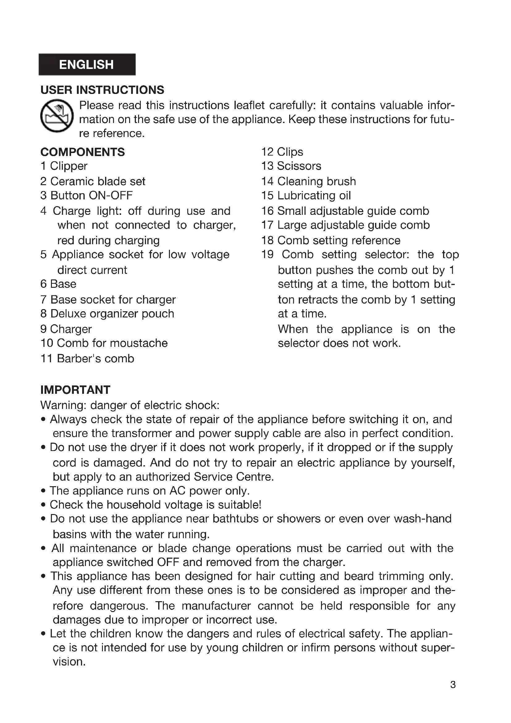 - Let the children know the dangers and rules of electrical safety. The applian- ce is not intended for use by young children or infirm persons without super- vision. COMPONENTS 1 Clipper 2 Ceramic blade set 3 Button ON-OFF 4 Charge light: off during use and when not connected to charger, red during charging 5 Appliance socket for low voltage direct current 6 Base 7 Base socket for charger 8 Deluxe organizer pouch 9 Charger 10 Comb for moustache 11 Barber's comb 12 Clips 13 Scissors 14 Cleaning brush 15 Lubricating oil 16 Small adjustable guide comb 17 Large adjustable guide comb 18 Comb setting reference 19 Comb setting selector: the top button pushes the comb out by 1 setting at a time, the bottom but- ton retracts the comb by 1 setting at a time. When the appliance is on the selector does not work. ENGLISH 00060452 INTERNO 7-11-2005 14:43 Pagina 34