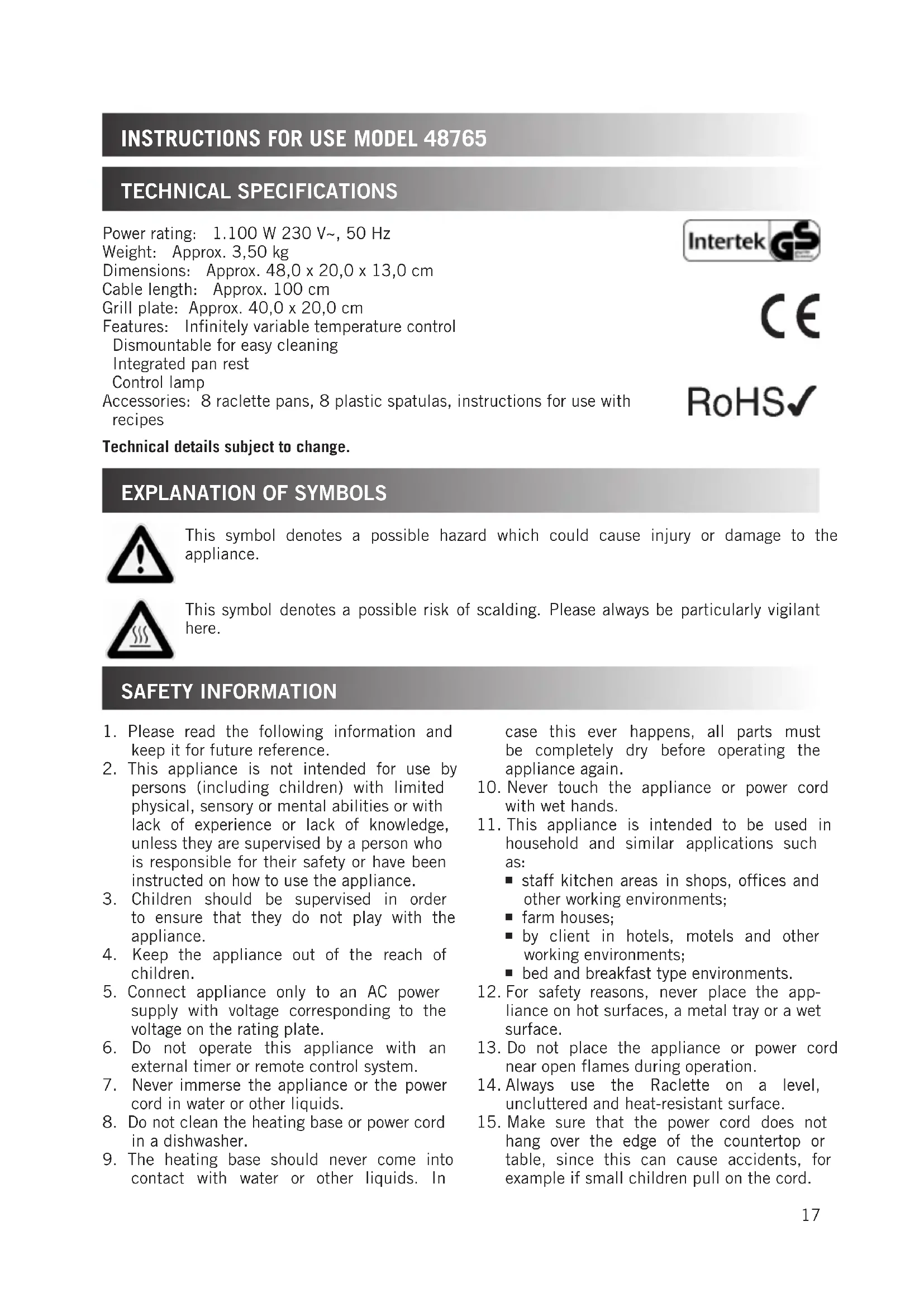 Safety infoRmation technical SPecificationS Power rating: 1.100 W 230 V~, 50 Hz Weight: Approx. 3,50 kg Dimensions: Approx. 48,0 x 20,0 x 13,0 cm Cable length: Approx. 100 cm Grill plate: Approx. 40,0 x 20,0 cm Features: Infinitely variable temperature control Dismountable for easy cleaning Integrated pan rest Control lamp Accessories: 8 raclette pans, 8 plastic spatulas, instructions for use with recipes Technical details subject to change.