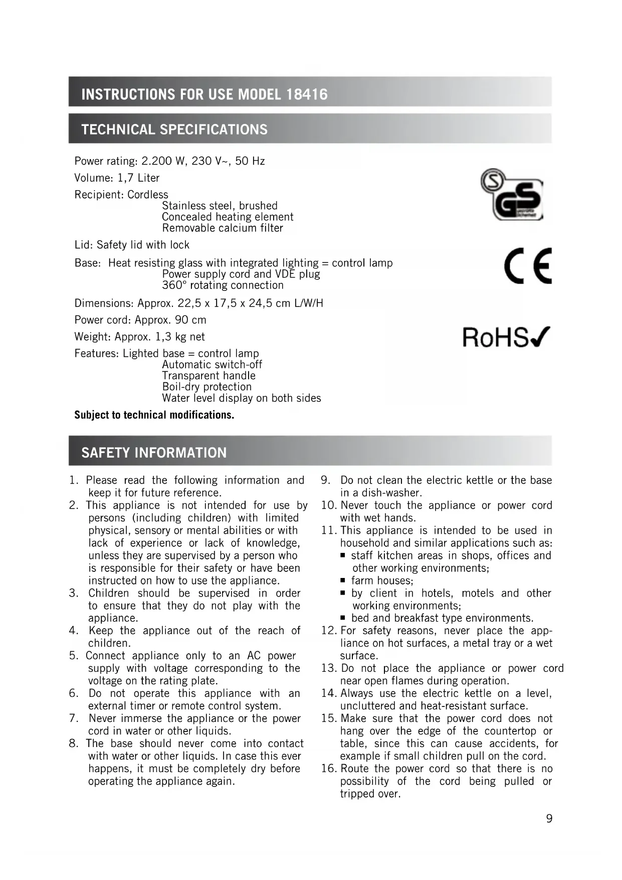 Download the instructions for your Kettle in PDF format for free! Find your manual 18416 - UNOLD and take your electronic device back in hand. On this page are published all the documents necessary for the use of your device. 18416 by UNOLD.
