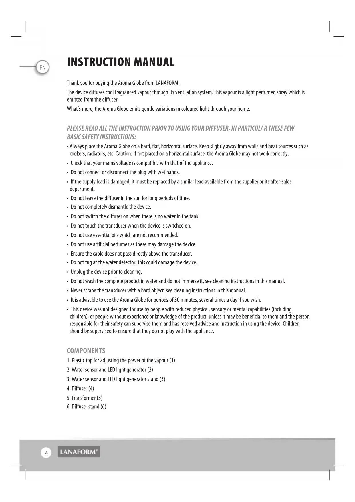 Aroma Globe 3EN INSTRUCTION MANUAL Thank you for buying the Aroma Globe from LANAFORM. The device diffuses cool fragranced vapour through its ventilation system. This vapour is a light perfumed spray which is emitted from the diffuser. What’s more, the Aroma Globe emits gentle variations in coloured light through your home. PLEASE READ ALL THE INSTRUCTION PRIOR TO USING YOUR DIFFUSER, IN PARTICULAR THESE FEW BASIC SAFETY INSTRUCTIONS: