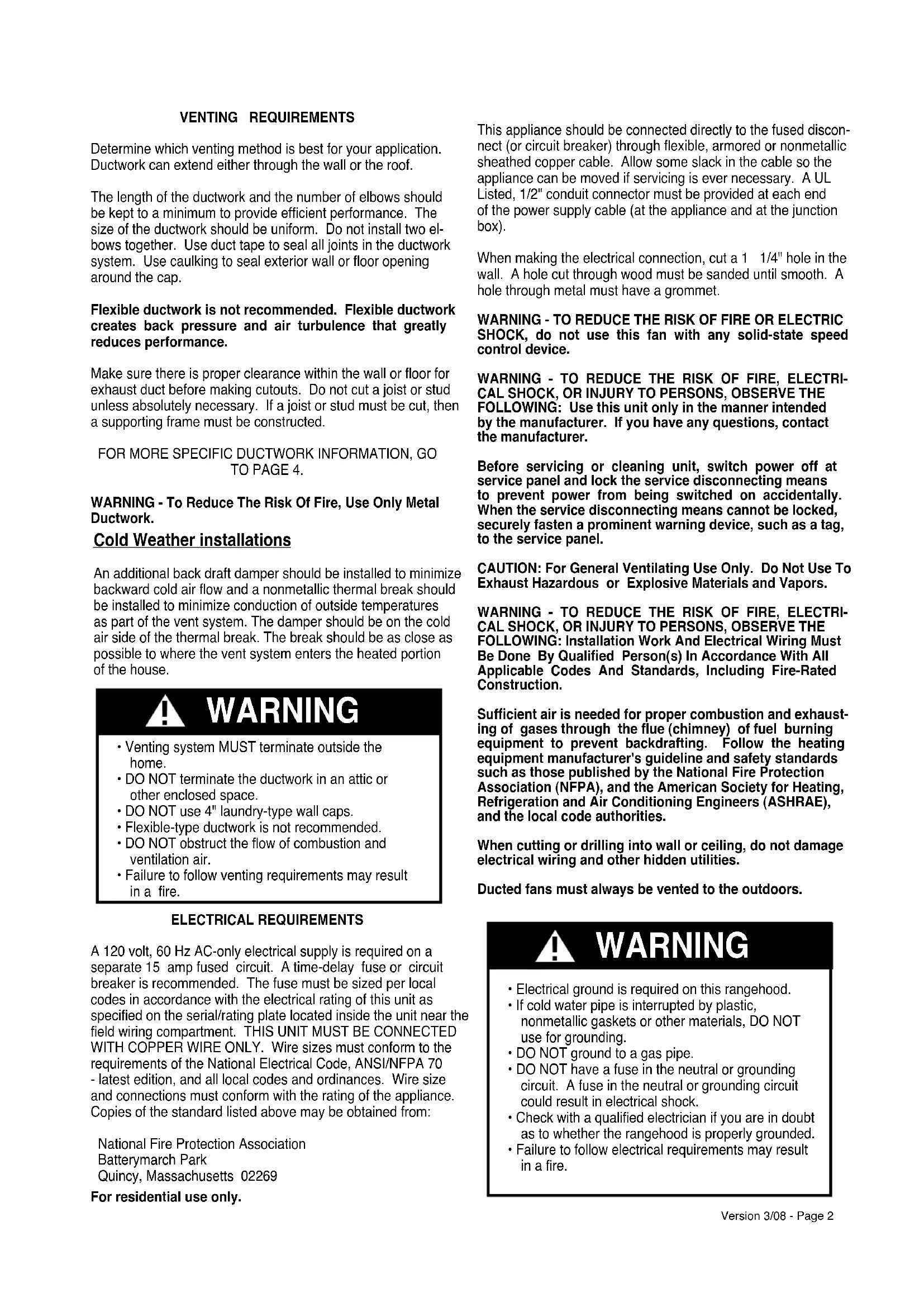 - Use and Care InformationVersion 3/08 - Page 2 VENTING REQUIREMENTS Determine which venting method is best for your application. Ductwork can extend either through the wall or the roof. The length of the ductwork and the number of elbows should be kept to a minimum to provide efcient performance. The size of the ductwork should be uniform. Do not install two el- bows together. Use duct tape to seal all joints in the ductwork system. Use caulking to seal exterior wall or oor opening around the cap. Flexible ductwork is not recommended. Flexible ductwork creates back pressure and air turbulence that greatly reduces performance. Make sure there is proper clearance within the wall or oor for exhaust duct before making cutouts. Do not cut a joist or stud unless absolutely necessary. If a joist or stud must be cut, then a supporting frame must be constructed.