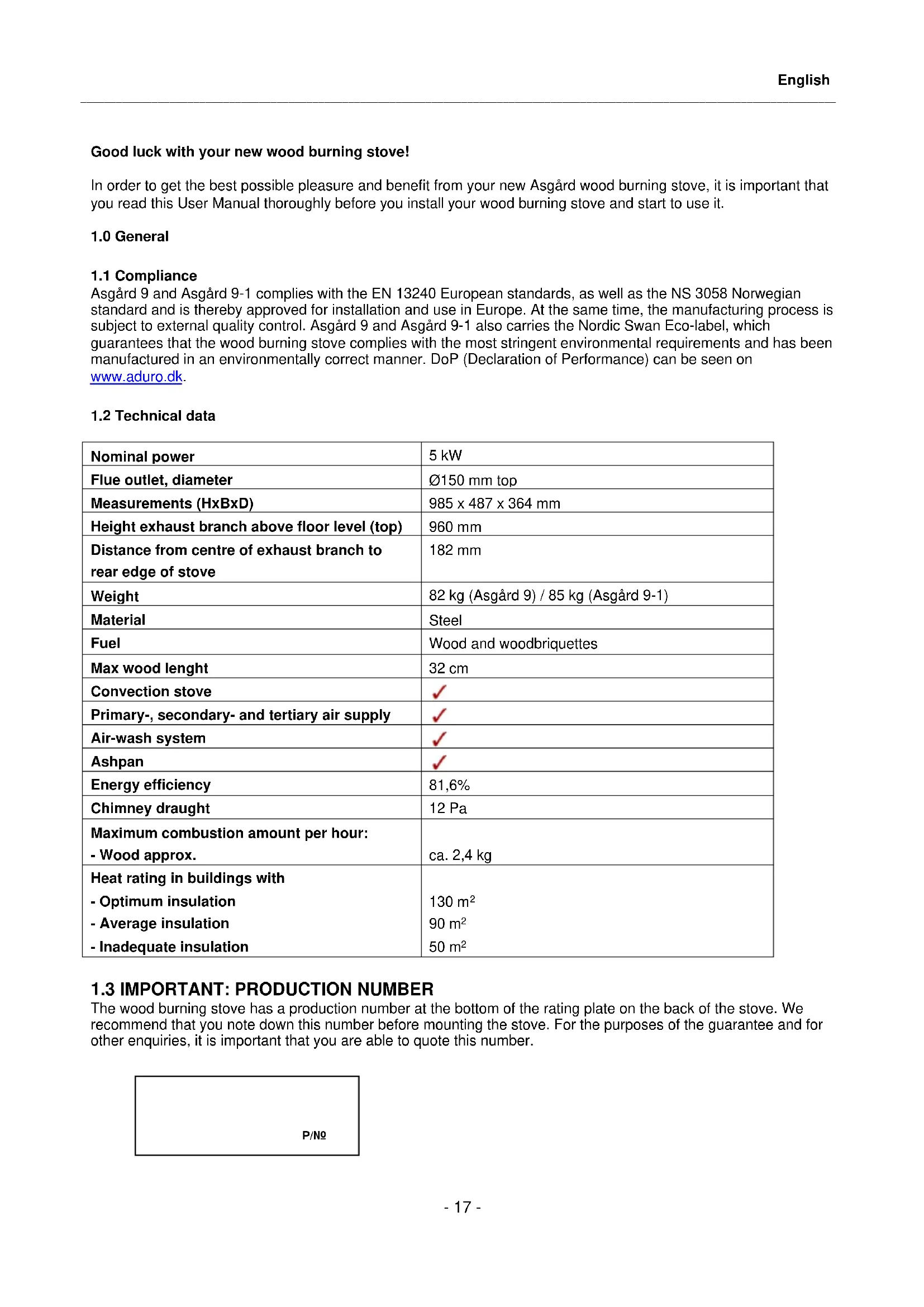 The wood burning stove has a production number at the bottom of the rating plate on the back of the stove. We recommend that you note down this number before mounting the stove. For the purposes of the guarantee and for other enquiries, it is important that you are able to quote this number. English P/Nr._______________________________________________________________________________________________________________________________