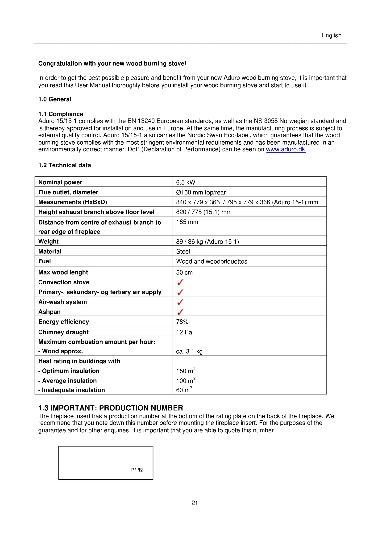 Aduro 15/15-1 complies with the EN 13240 European standards, as well as the NS 3058 Norwegian standard and is thereby approved for installation and use in Europe. At the same time, the manufacturing process is subject to external quality control. Aduro 15/15-1 also carries the Nordic Swan Eco-label, which guarantees that the wood burning stove complies with the most stringent environmental requirements and has been manufactured in an environmentally correct manner. DoP (Declaration of Performance) can be seen on www.aduro.dk.