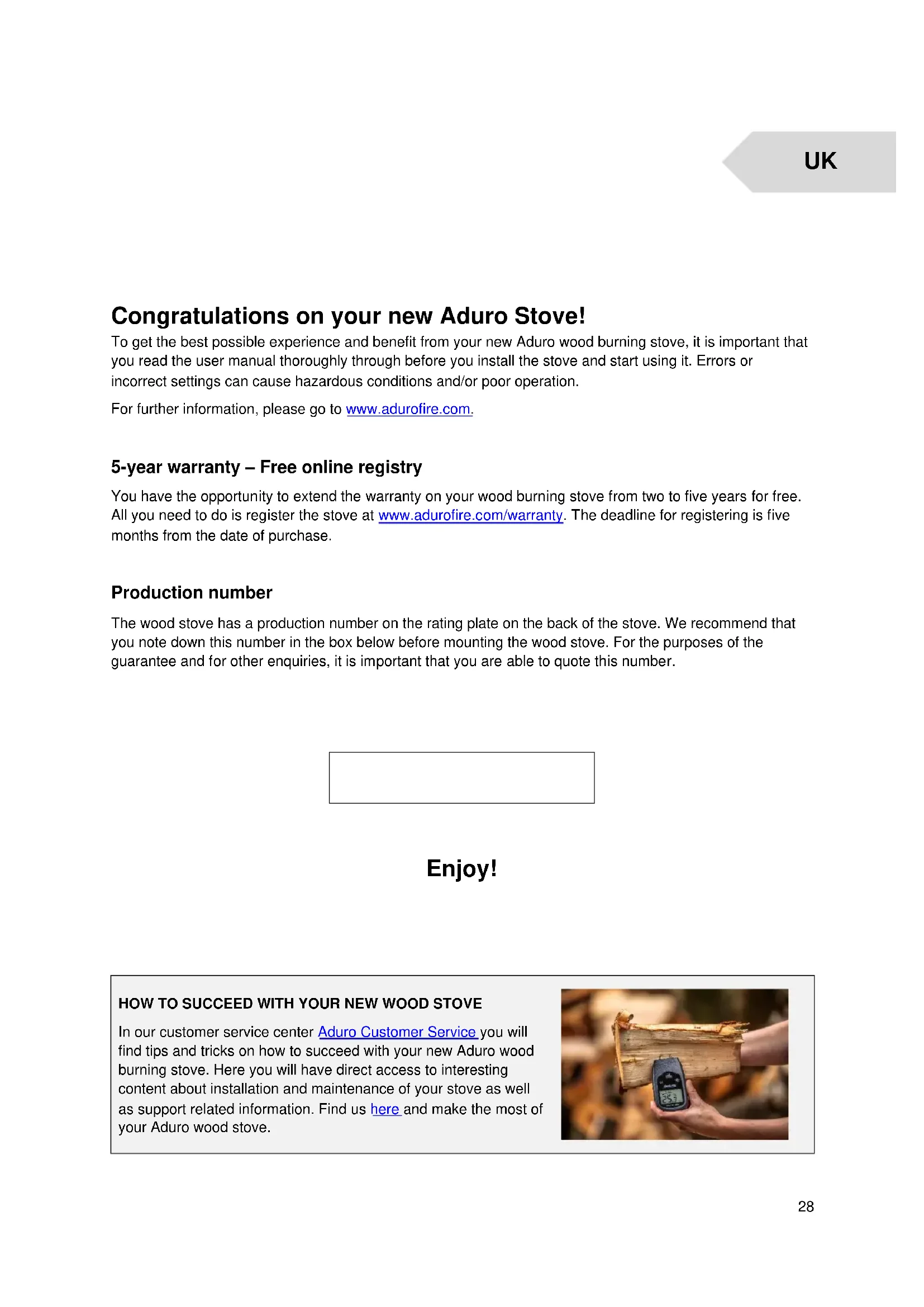 Congratulations on your new Aduro Stove! To get the best possible experience and benefit from your new Aduro wood burning stove, it is important that you read the user manual thoroughly through before you install the stove and start using it. Errors or incorrect settings can cause hazardous conditions and/or poor operation. For further information, please go to www.adurofire.com. 5-year warranty – Free online registry You have the opportunity to extend the warranty on your wood burning stove from two to five years for free. All you need to do is register the stove at www.adurofire.com/warranty. The deadline for registering is five months from the date of purchase. Production number The wood stove has a production number on the rating plate on the back of the stove. We recommend that you note down this number in the box below before mounting the wood stove. For the purposes of the guarantee and for other enquiries, it is important that you are able to quote this number.