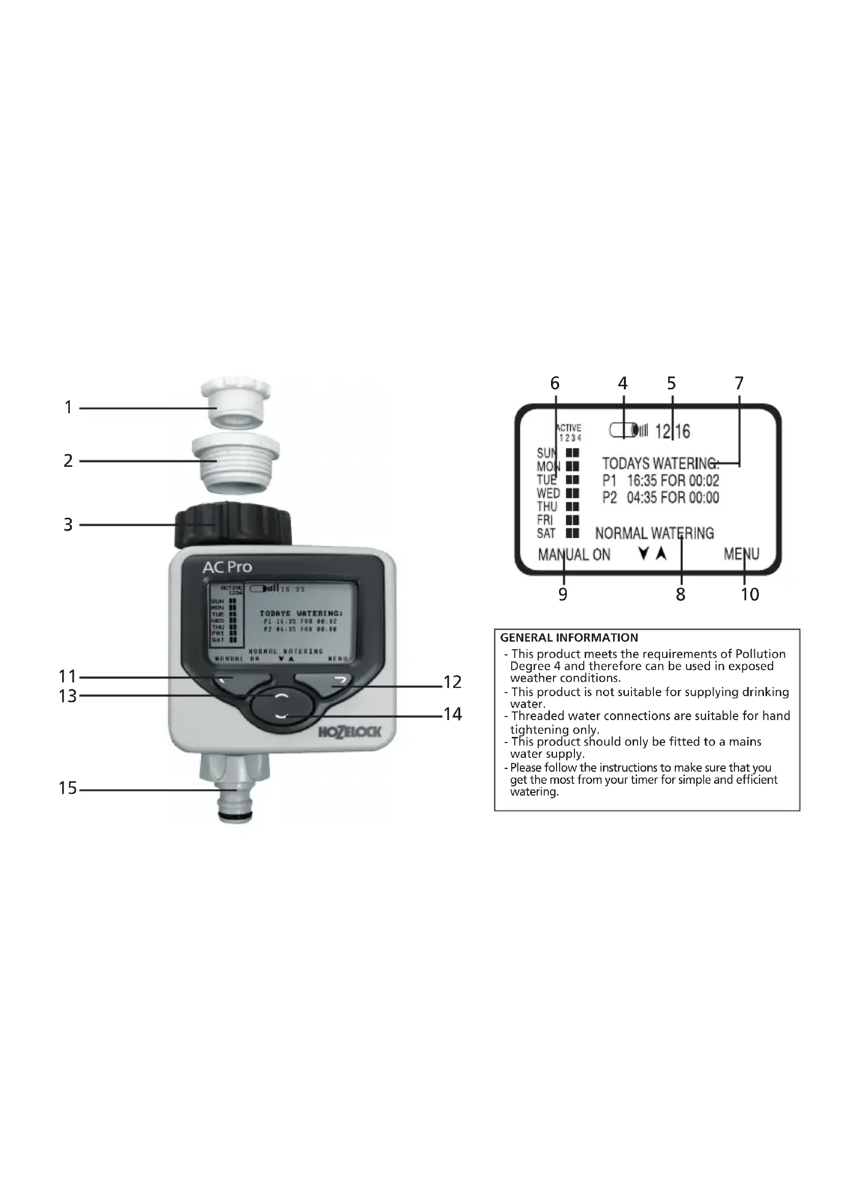 go back to make changes ( ). MANUAL OPERATION This will operate watering immediately, without using any programs. It will override any active programs. 1 1/2 Inch adaptor 2 3/4 Inch adaptor 3 1 Inch Adaptor (fitted) 4 Battery level 5 Current time 6 Watering program overview 7 Today’s watering programs (if set) 8 Watering mode 9 Left button screen prompt 10 Right button screen prompt 11 Left button (red) 12 Right button (green) 13 Up button (blue) 14 Down Button (blue) 15 Hose pipe connector