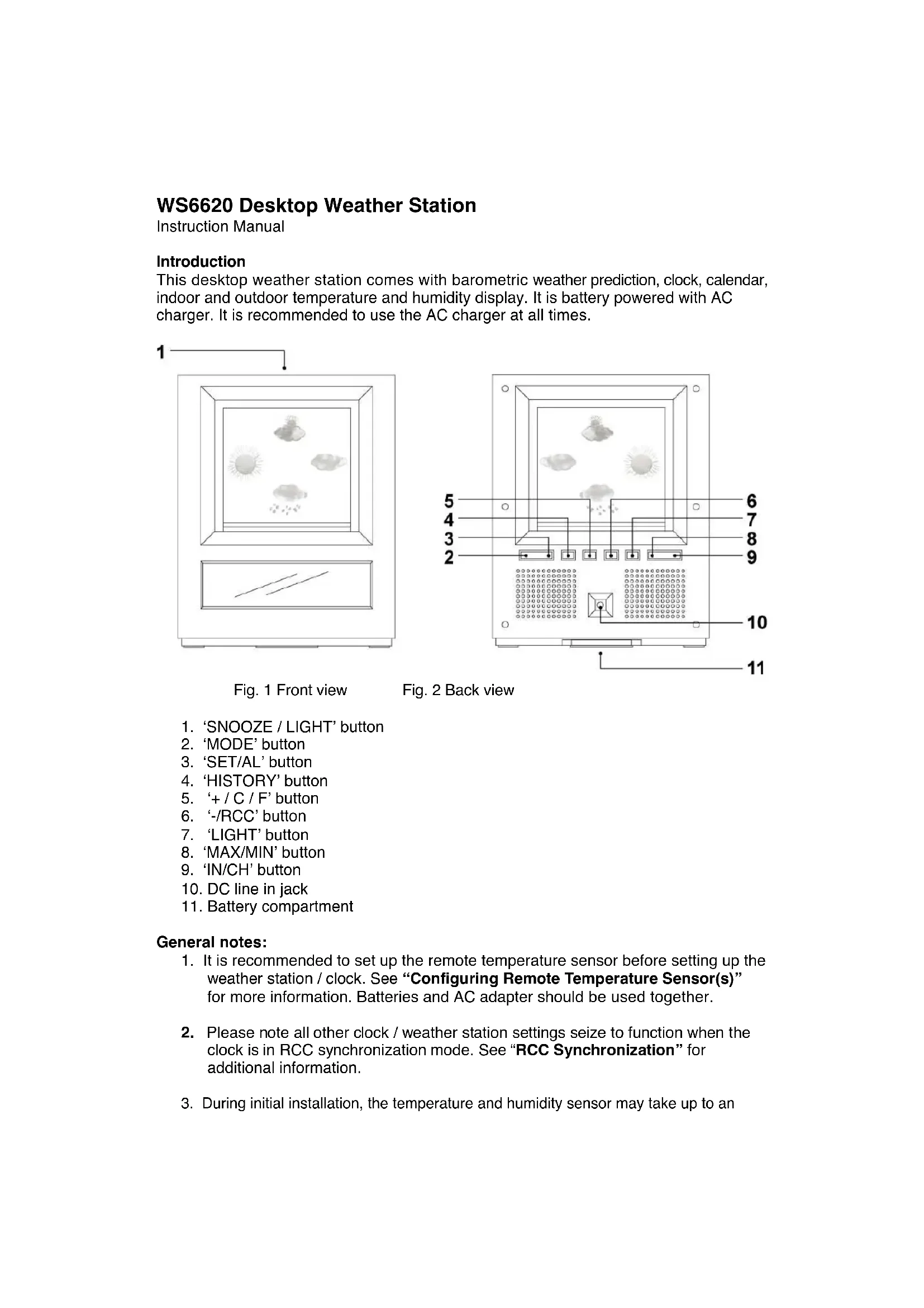 weather station / clock. See “Configuring Remote Temperature Sensor(s)” for more information. Batteries and AC adapter should be used together.