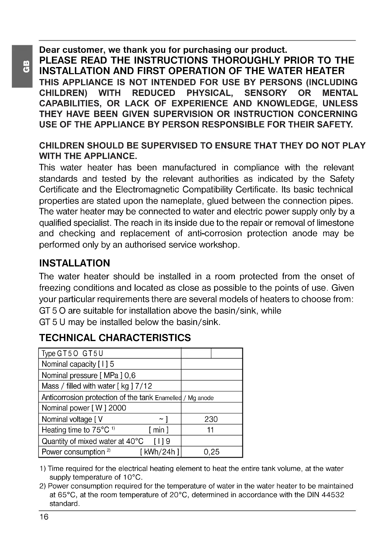 Type GT5O GT5U Nominal capacity [ l ] 5 Nominal pressure [ MPa ] 0,6 Mass / filled with water [ kg ] 7/12 Anticorrosion protection of the tank Enamelled / Mg anode Nominal power [ W ] 2000 Nominal voltage [ V