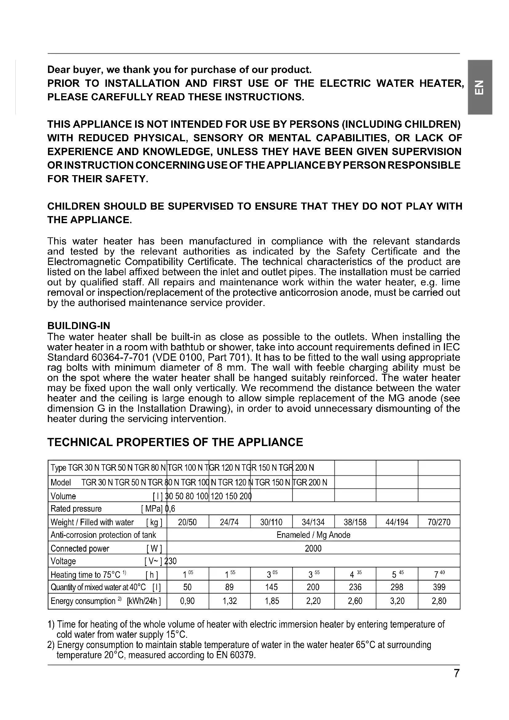 Dear buyer, we thank you for purchase of our product. PRIOR TO INSTALLATION AND FIRST USE OF THE ELECTRIC WATER HEATER, PLEASE CAREFULLY READ THESE INSTRUCTIONS. THIS APPLIANCE IS NOT INTENDED FOR USE BY PERSONS (INCLUDING CHILDREN) WITH REDUCED PHYSICAL, SENSORY OR MENTAL CAPABILITIES, OR LACK OF EXPERIENCE AND KNOWLEDGE, UNLESS THEY HAVE BEEN GIVEN SUPERVISION OR INSTRUCTION CONCERNING USE OF THE APPLIANCE BY PERSON RESPONSIBLE FOR THEIR SAFETY. CHILDREN SHOULD BE SUPERVISED TO ENSURE THAT THEY DO NOT PLAY WITH THE APPLIANCE. This water heater has been manufactured in compliance with the relevant standards and tested by the relevant authorities as indicated by the Safety Certifi cate and the Electromagnetic Compatibility Certifi cate. The technical characteristics of the product are listed on the label affi xed between the inlet and outlet pipes. The installation must be carried out by qualifi ed staff. All repairs and maintenance work within the water heater, e.g. lime removal or inspection/replacement of the protective anticorrosion anode, must be carried out by the authorised maintenance service provider. BUILDING-IN The water heater shall be built-in as close as possible to the outlets. When installing the water heater in a room with bathtub or shower, take into account requirements defi ned in IEC Standard 60364-7-701 (VDE 0100, Part 701). It has to be fi tted to the wall using appropriate rag bolts with minimum diameter of 8 mm. The wall with feeble charging ability must be on the spot where the water heater shall be hanged suitably reinforced. The water heater may be fi xed upon the wall only vertically. We recommend the distance between the water heater and the ceiling is large enough to allow simple replacement of the MG anode (see dimension G in the Installation Drawing), in order to avoid unnecessary dismounting of the heater during the servicing intervention.