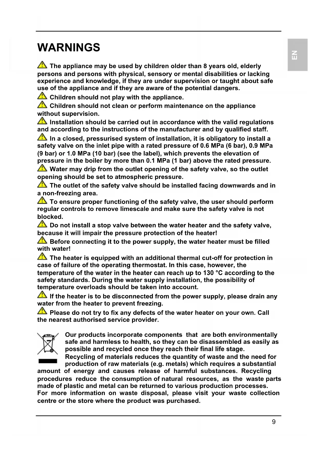 WARNINGS The appliance may be used by children older than 8 years old, elderly persons and persons with physical, sensory or mental disabilities or lacking experience and knowledge, if they are under supervision or taught about safe use of the appliance and if they are aware of the potential dangers. Children should not play with the appliance. Children should not clean or perform maintenance on the appliance without supervision. Installation should be carried out in accordance with the valid regulations and according to the instructions of the manufacturer and by qualified staff. In a closed, pressurised system of installation, it is obligatory to install a safety valve on the inlet pipe with a rated pressure of 0.6 MPa (6 bar), 0.9 MPa (9 bar) or 1.0 MPa (10 bar) (see the label), which prevents the elevation of pressure in the boiler by more than 0.1 MPa (1 bar) above the rated pressure. Water may drip from the outlet opening of the safety valve, so the outlet opening should be set to atmospheric pressure. The outlet of the safety valve should be installed facing downwards and in a non-freezing area. To ensure proper functioning of the safety valve, the user should perform regular controls to remove limescale and make sure the safety valve is not blocked. Do not install a stop valve between the water heater and the safety valve, because it will impair the pressure protection of the heater! Before connecting it to the power supply, the water heater must be filled with water! The heater is equipped with an additional thermal cut-off for protection in case of failure of the operating thermostat. In this case, however, the temperature of the water in the heater can reach up to 130 °C according to the safety standards. During the water supply installation, the possibility of temperature overloads should be taken into account. If the heater is to be disconnected from the power supply, please drain any water from the heater to prevent freezing. Please do not try to fix any defects of the water heater on your own. Call the nearest authorised service provider. Our products incorporate components that are both environmentally safe and harmless to health, so they can be disassembled as easily as possible and recycled once they reach their final life stage. Recycling of materials reduces the quantity of waste and the need for production of raw materials (e.g. metals) which requires a substantial amount of energy and causes release of harmful substances. Recycling procedures reduce the consumption of natural resources, as the waste parts made of plastic and metal can be returned to various production processes. For more information on waste disposal, please visit your waste collection centre or the store where the product was purchased.10