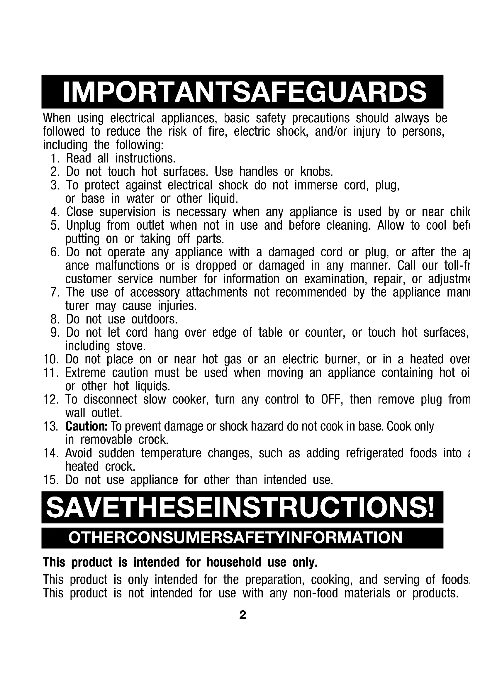 This product is intended for household use only. This product is only intended for the preparation, cooking, and serving of foods. This product is not intended for use with any non-food materials or products.3 WARNING! Shock Hazard: This appliance has a polarized plug (one wide blade) that reduces the risk of electric shock. The plug fits only one way into a polarized outlet. Do not defeat the safety purpose of the plug by modifying the plug in any way or using an adaptor. If the plug does not fit, reverse the plug. If it still does not fit, have an electrician replace the outlet. The length of the cord used on this appliance was selected to reduce the hazards of becoming tangled in, or tripping over a longer cord. If a longer cord is necessary an approved extension cord may be used. The electrical rating of the extension cord must be equal to or greater than the rating of the slow cooker. Care must be taken to arrange the extension cord so that it will not drape over the countertop or tabletop where it can be pulled on by children or accidentally tripped over. LID AND CROCK: