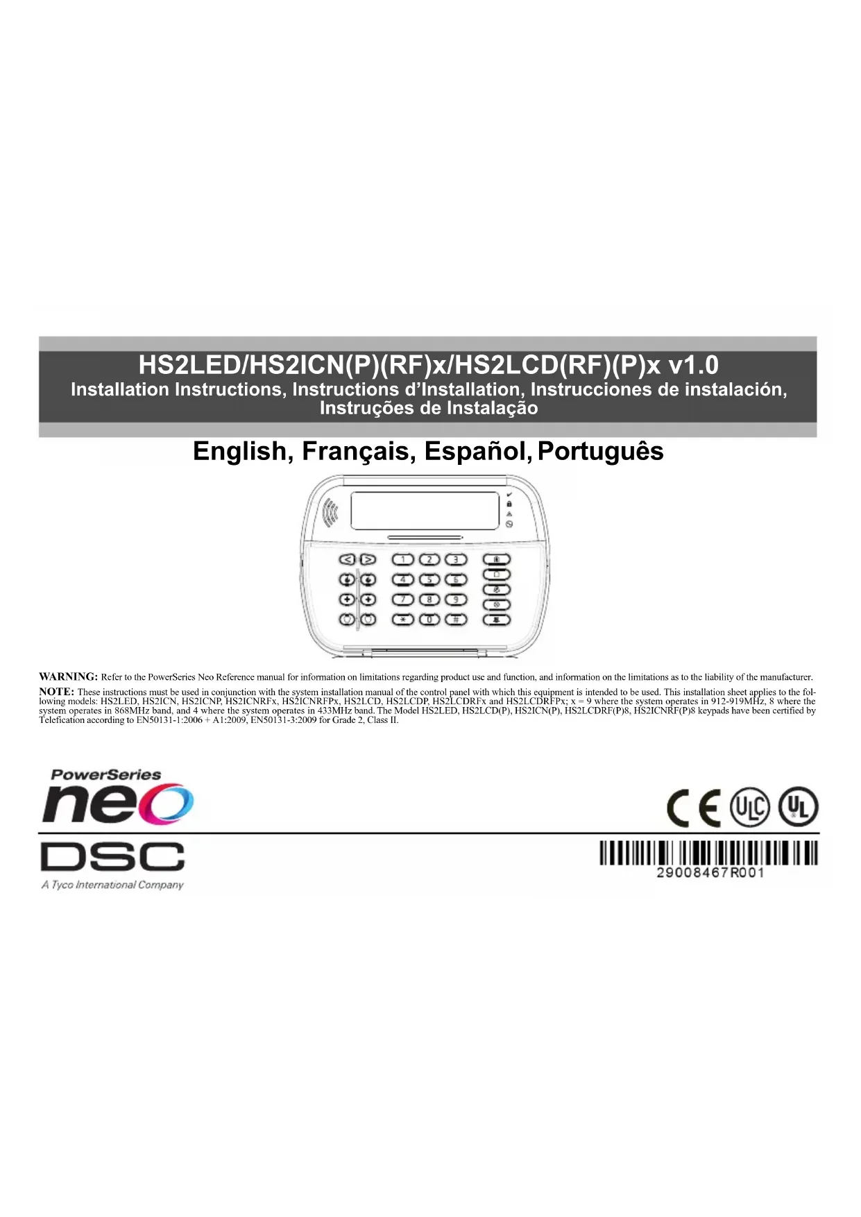 English, Français, Español, Português WARNING: Refer to the PowerSeries Neo Reference manual for information on limitations regarding product use and function, and information on the limitations as to the liability of the manufacturer. NOTE: These instructions must be used in conjunction with the system installation manual of the control panel with which this equipment is intended to be used. This installation sheet applies to the fol- lowing models: HS2LED, HS2ICN, HS2ICNP, HS2ICNRFx, HS2ICNRFPx, HS2LCD, HS2LCDP, HS2LCDRFx and HS2LCDRFPx; x = 9 where the system operates in 912-919MHz, 8 where the system operates in 868MHz band, and 4 where the system operates in 433MHz band. The Model HS2LED, HS2LCD(P), HS2ICN(P), HS2LCDRF(P)8, HS2ICNRF(P)8 keypads have been certified by Telefication according to EN50131-1:2006 + A1:2009, EN50131-3:2009 for Grade 2, Class II. HS2LED/HS2ICN(P)(RF)x/HS2LCD(RF)(P)x v1.0 Installation Instructions, Instructions d’Installation, Instrucciones de instalación, Instruções de InstalaçãoThe HS2LED/HS2ICN(P)(RF)x/HS2LCD(RF)(P)x keypads are compatible with the PowerSeries Neo HS2016/32/64, HS2014- 4* and HS2128 panels. The RF keypads combine a wireless transceiver with the respective HS2 keypad.