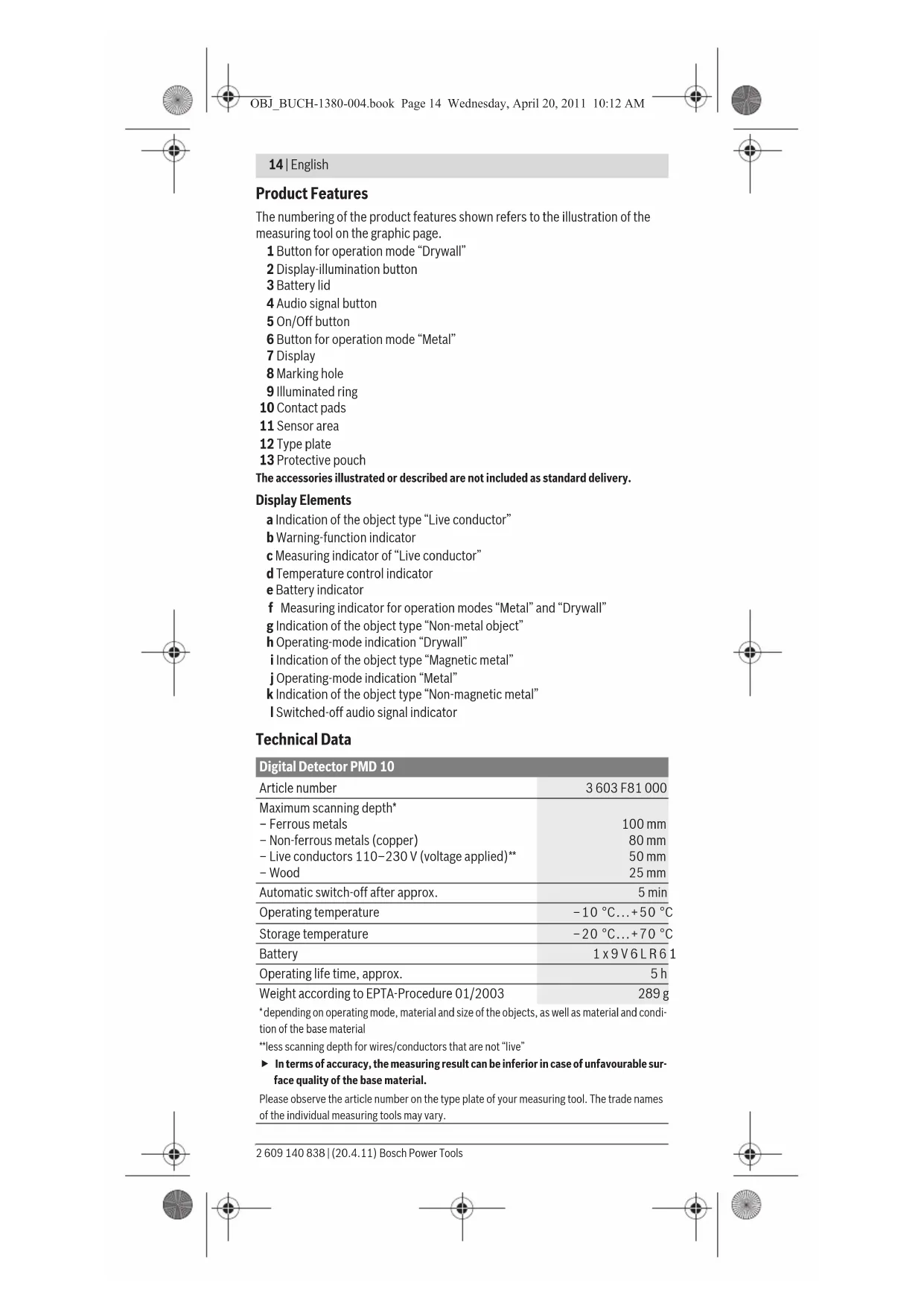 Weight according to EPTA-Procedure 01/2003 289 g *depending on operating mode, material and size of the objects, as well as material and condi- tion of the base material **less scanning depth for wires/conductors that are not “live” f In terms of accuracy, the measuring result can be inferior in case of unfavourable sur- face quality of the base material. Please observe the article number on the type plate of your measuring tool. The trade names of the individual measuring tools may vary. OBJ_BUCH-1380-004.book Page 14 Wednesday, April 20, 2011 10:12 AMEnglish | 15 Bosch Power Tools 2 609 140 838 | (20.4.11) Declaration of Conformity We declare under our sole responsibility that the product described under “Technical Data” is in conformity with the following standards or standardization documents: EN 61010-1:2010-10, EN 61326-1:2006-05, EN 301489-3:2002-08, EN 301489-1:2008-04, EN 300330-1:2010-02, EN 300330-2:2010-02 according to the provisions of the directives 2004/108/EC, 1999/5/EC. Robert Bosch GmbH, Power Tools Division D-70745 Leinfelden-Echterdingen Leinfelden, 01.04.2011 Assembly Inserting/Replacing the Battery Alkali-manganese batteries are recommended for the measuring tool. To open the battery lid 3, slide it in the direction of the arrow away from the bat- tery compartment. Insert the battery provided. When inserting, pay attention to the correct polarity according to the representation on the inside of the battery compartment. The battery indicator e always indicates the current battery status: – Battery fully charged – Battery has 2/3 of its capacity or less – Battery has 1/3 of its capacity or less – Please change battery f If the measuring tool is not used for a long period of time, the battery must be removed. The battery can corrode or discharge itself over long periods. Operation f Protect the measuring tool against moisture and direct sun light. f Do not subject the measuring tool to extreme temperatures or variations in temperature. In case of large variations in temperature, allow the measuring tool to adjust to the ambient temperature before switching it on. In case of extreme temperatures or variations in temperature, the accu- racy of the measuring tool and the display indication can be impaired. f Use or operation of transmitting systems, such as WLAN, UMTS, radar, transmitter masts or microwaves, in the close proximity can influence the measuring function. Initial Operation Switching On and Off f Before switching the measuring tool on, make sure that the sensor area 11 is not moist. If required, dry the measuring tool using a soft cloth. f If the measuring tool was subject to an extreme temperature change, allow it to adjust to the ambient temperature before switching on. To switch on the measuring tool, press the On/Off button 5. To switch off the measuring tool, press the On/Off button 5 again. When no button on the measuring tool is pressed for approx. 5 minutes and when no objects are detected, the measuring tool automatically switches off to save the battery. Dr. Egbert Schneider Senior Vice President Engineering Dr. Eckerhard Strötgen Head of Product Certification OBJ_BUCH-1380-004.book Page 15 Wednesday, April 20, 2011 10:12 AM16 | English 2 609 140 838 | (20.4.11) Bosch Power Tools Switching the Display Illumination On/Off The display illumination can be switched on/off with display-illumination button 2. Switching the Audio Signal On/Off The audio signal can be switched on/off with the audio signal button 4. When the audio signal is switched off, indication l appears on the display. Method of Operation (see figure A) The measuring tool checks the base material of sensor area 11 in measurement direction z to the max. detection depth (see “Technical Data”). Objects are de- tected that differ from the material of the wall. Always move the measuring tool in a straight line over the surface applying slight pressure, without lifting it off or changing the pressure. During measurement, the contact pads 10 must always have contact to the surface. Measuring Procedure Position the measuring tool on/against the surface being detected, and move it in direction of axis x and y. When the measuring tool comes closer to an object, the amplitude in measuring indicator f increases and ring 9 lights up yellow; when it is moved away from the object, the amplitude decreases. Measuring in- dicator f indicates the maximal amplitude above the centre of the object; ring 9 lights up red and an audio signal sounds. For small or deeply embedded objects, ring 9 can continue to light up yellow, while there is no audio signal. f Wide objects are not indicated by the illuminated ring or the audio signal throughout their complete width. To localise the object more precisely, move the measuring tool repeatedly (3x) back and forth over the object. Wider objects in the base material are detected through a continuous, high am- plitude of measuring indicator f. Ring 9 lights up yellow. The duration of the high amplitude corresponds approximately with the object width. When very small or deeply embedded objects are being sought and measuring indicator f reacts only slightly, move the measuring tool repeatedly over the ob- ject in horizontal (axis x) and vertical (axis y) direction. f Before drilling, sawing or routing into a wall, protect yourself against hazards by using other information sources. As the measuring results can be influenced through ambient conditions or the wall material, there may be a hazard even though the indicator does not indicate an object in the sensor range (no audio signal or beep and and the illuminated ring 9 lit green). Operating Modes The best measuring results are achieved through selection of the operating mode. The maximal detection depth for metal objects is achieved in the operat- ing mode “Metal”. The maximal detection depth for non-metal objects is achieved in the operating mode “Drywall”. “Live” conductors are detected