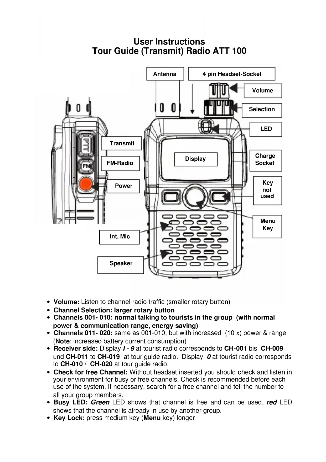 - Receiver side: Display I - 9 at tourist radio corresponds to CH-001 bis CH-009 und CH-011 to CH-019 at tour guide radio. Display 0 at tourist radio corresponds to CH-010 / CH-020 at tour guide radio.